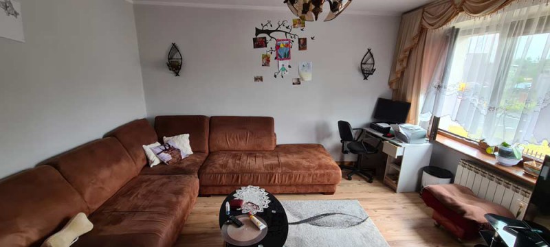 W budynku zamontowane są okna pcv w kolorze brązowym, 3 szybowe (na gwarancji), wymienione zostały parapety oraz stolarka drzwiowa wewnętrzna. Na podłogach znajdują się lakierowane deski, panele i kafle ceramiczne. Kuchnia jest widna. Obie łazienki wykończone są w płytkach ceramicznych, w jednej znajduje się prysznic, a w drugiej łazience wanna. Centralne ogrzewanie zasila piec miałowy zasypowy firmy "Pawlak", instalacja jest stalowa a grzejniki aluminiowe.