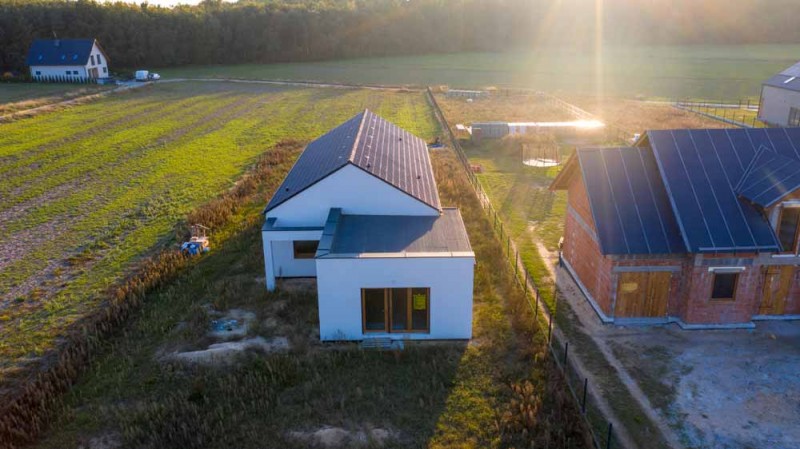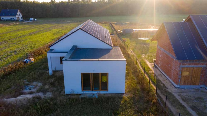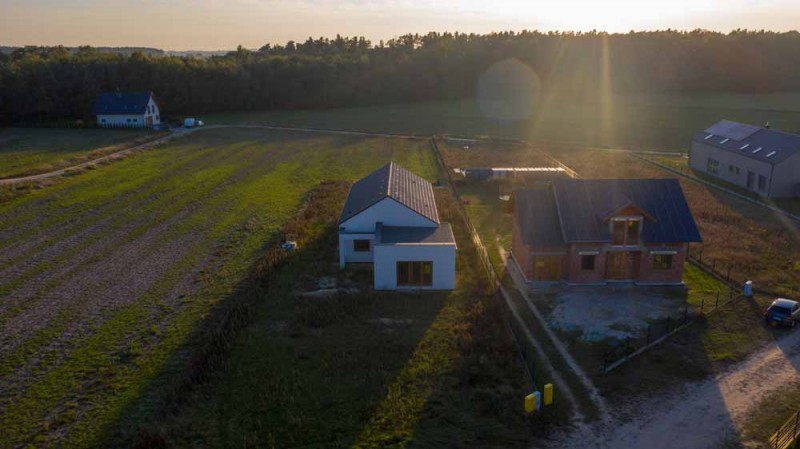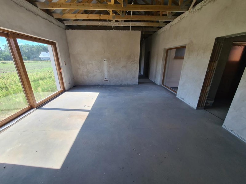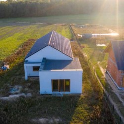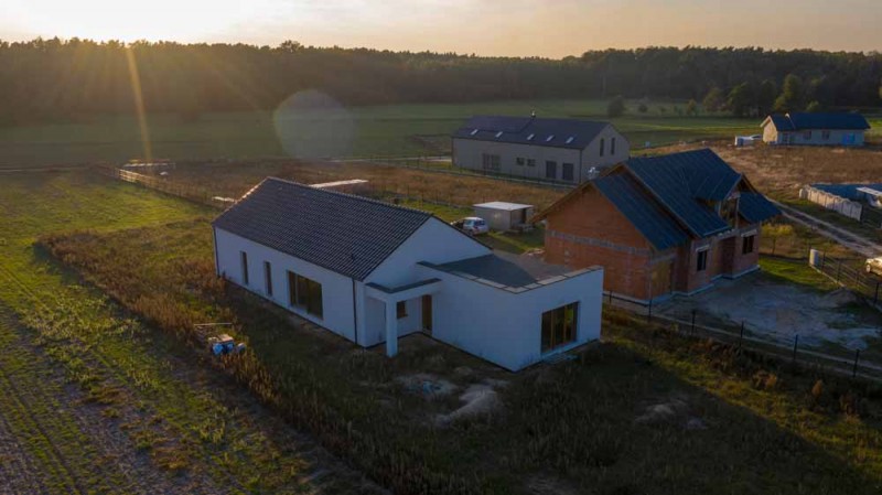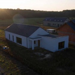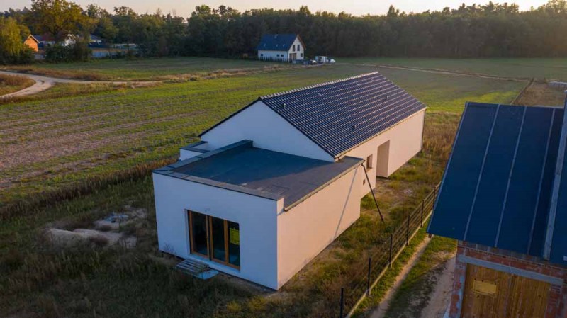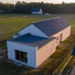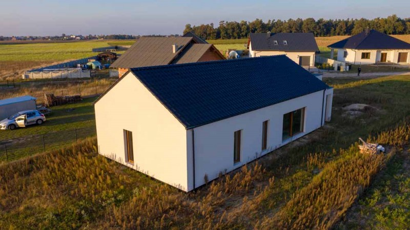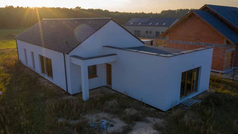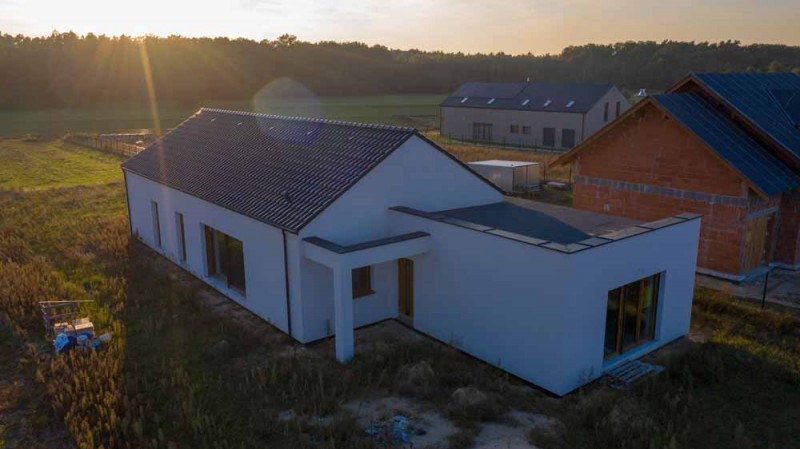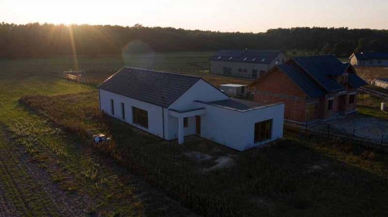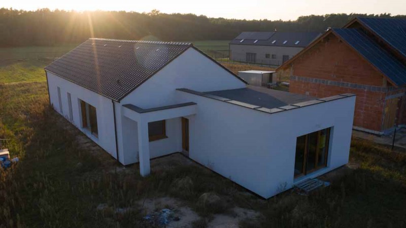 Dom został wybudowany z pustaka ceramicznego porotherm, jego mur zewnętrzny jest ocieplony styropianem, został również pokryty tynkiem. Dwuspadowy dach na konstrukcji drewnianej posiada membranę, został pokryty dachówką ceramiczną i jest częściowo deskowany. Zamontowane są wysokiej jakości okna drewniane a okno tarasowe w salonie jest w systemie HS. Jest rozprowadzone centralne ogrzewanie podłogowe a ściany są pokryte tynkiem.
