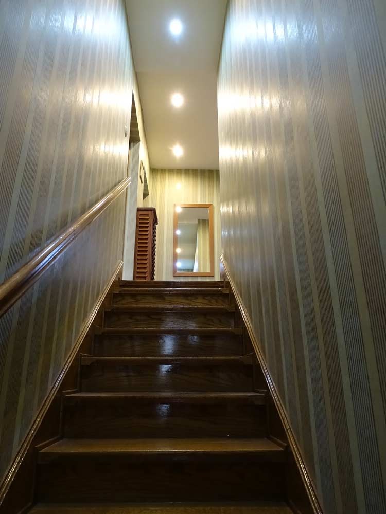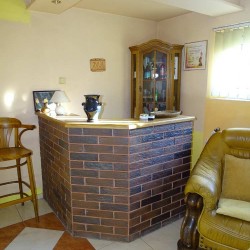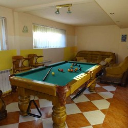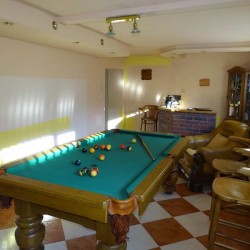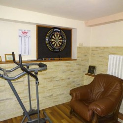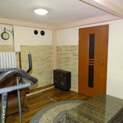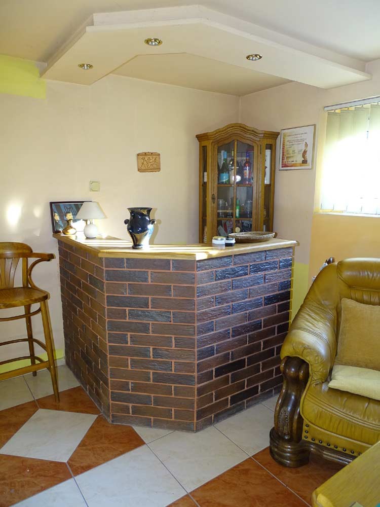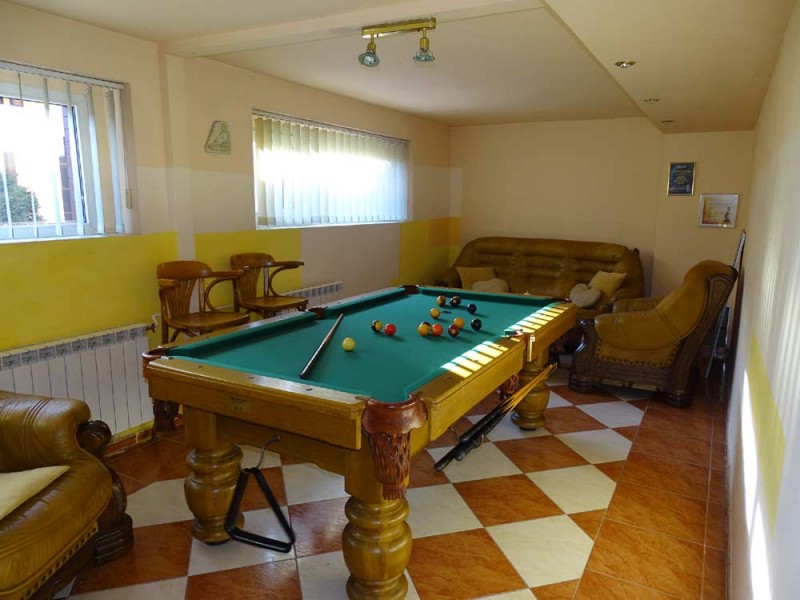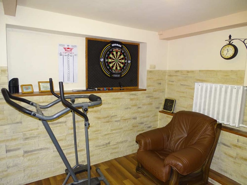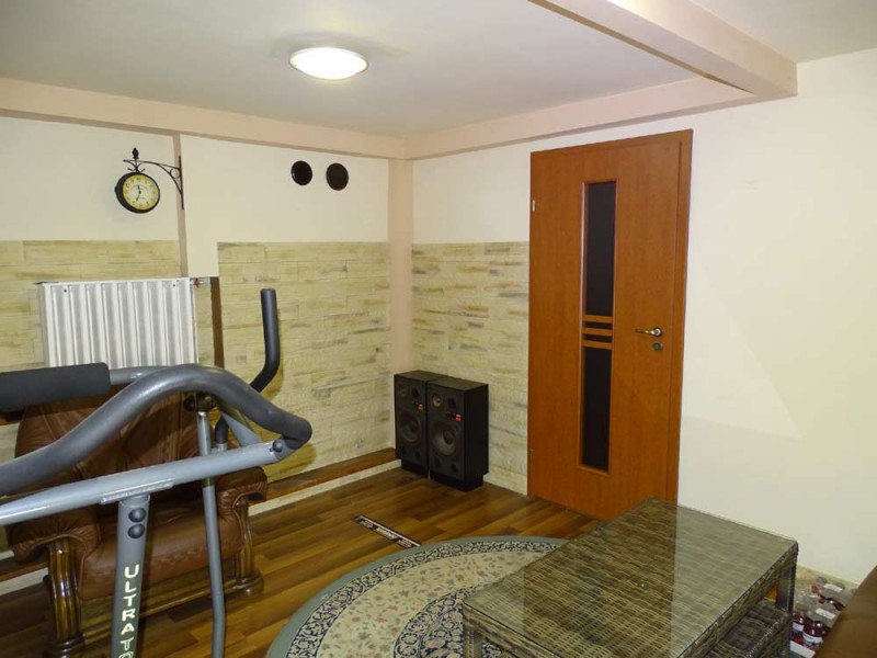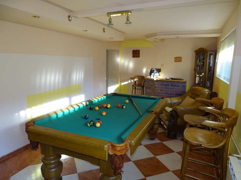 Na parterze znajduje się część z przeznaczeniem na wypoczynek i rekreację składająca się z dwóch pomieszczeń i barku, 1 pokój, łazienka, wiatrołap oraz część gospodarcza - kotłownia oraz dwustanowiskowy garaż. Piętro obejmuje 4 pokoje, kuchnię z wyjściem na taras znajdujący się nad garażami, łazienkę oraz balkon.