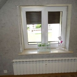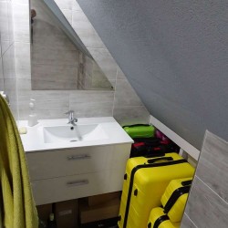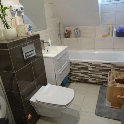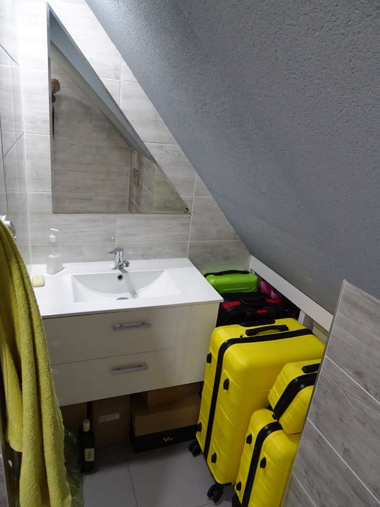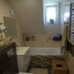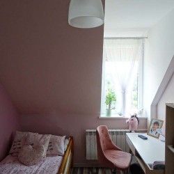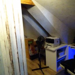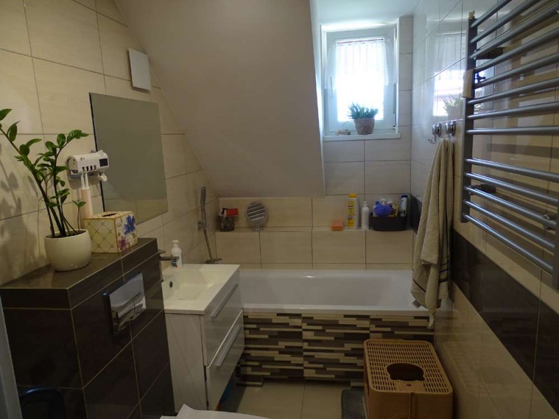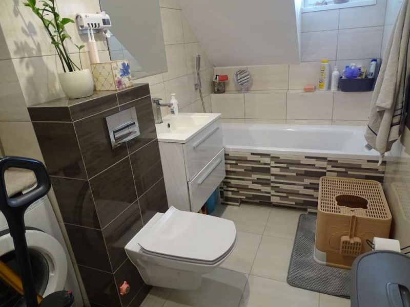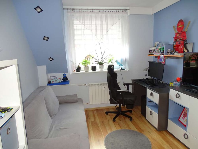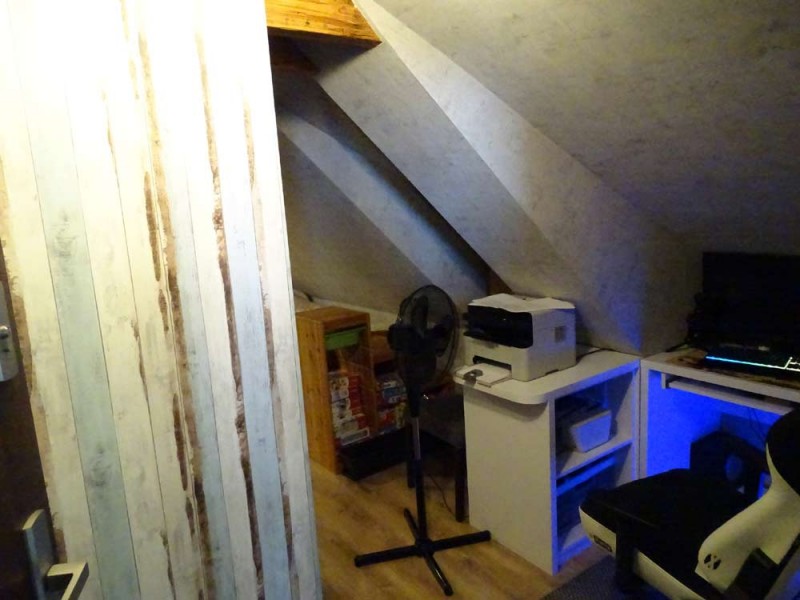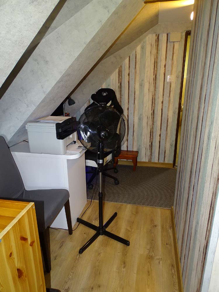 Drugi poziom posiada doprowadzone media, jest również ogrzewany. Dach jest po remoncie, zostało wymienione pokrycie wierzchnie - blacha, założona została membrana i wykonano docieplenie dachu wełną mineralną. Ściany wykończone zostały płytą karton gips a podłogi wyłożone są w panelach i kaflach ceramicznych. W toalecie zamontowano geberit i umywalkę wraz z szafką. Okno zamykane jest roletą zewnętrzną aluminiową.