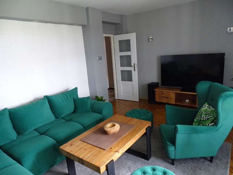 Zamontowane są okna PCV (część z nich wyposażono w rolety zewnętrzne aluminiowe) a na podłogach znajduje się mozaika w bardzo dobrym stanie, panele i kafle ceramiczne. Salon jest klimatyzowany. Wymienione zostały wszystkie instalacje, stolarkę drzwiową wewnętrzną i drzwi wejściowe do lokali a ściany są gipsowane. Widna kuchnia został umeblowana meblami na wymiar, posiada zabudowany sprzęt gospodarstwa domowego - lodówko - zamrażarkę, płytę gazową, piekarnik elektryczny, kuchnię mikrofalową, zmywarkę i pochłaniacz pary. Łazienka z oknem została wykończona w płytkach ceramicznych, zainstalowano w niej wannę, geberit i umywalkę wraz z szafką. Wodę ciepłą i centralne ogrzewanie zasila ciepłownia miejska, grzejniki są aluminiowe. Cena obejmuje umeblowanie i wyposażenie kuchni oraz dwie pojemne szafy garderobiane na wymiar. Pozostałe umeblowanie jest w opcji.