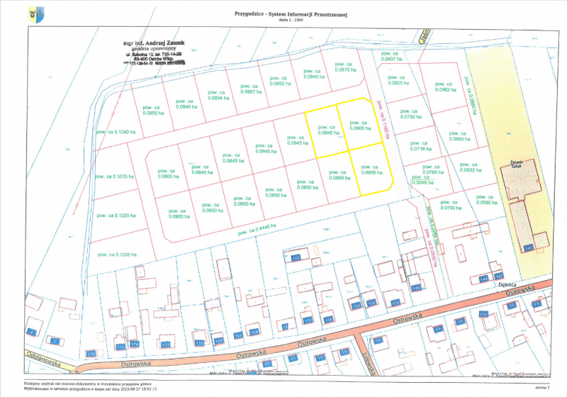 Działki w trakcie podziału geodezyjnego, nie zostały objęte miejscowym planem zagospodarowania przestrzennego. Media: energia elektryczna, woda oraz gaz w ulicy Ostrowskiej.