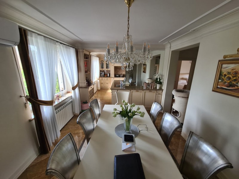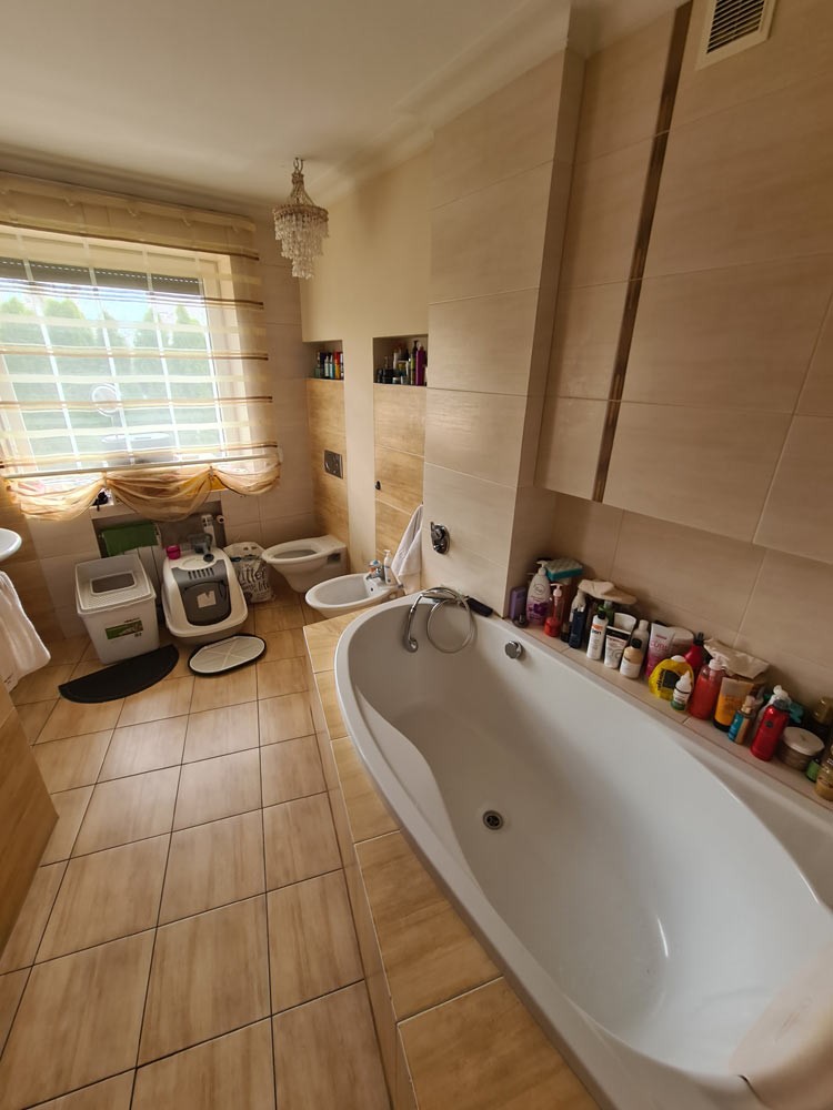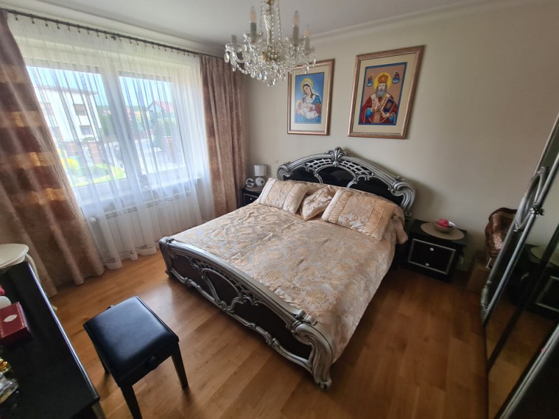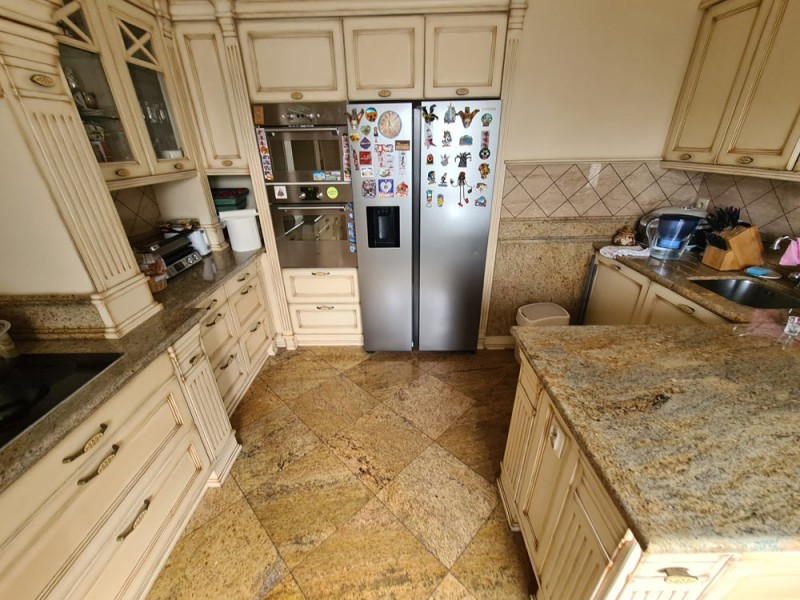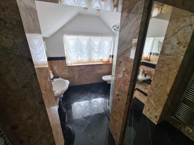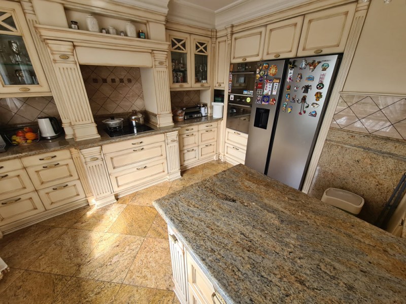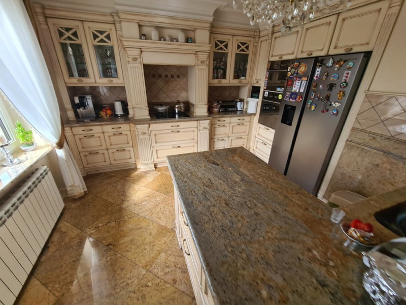 Kuchnia z nowoczesną stylową zabudową jest wyposażona w sprzęt gospodarstwa domowego. Meble kuchenne w stylu prowansalskim posiadają blaty wykonane również z granitu. Pomieszczenia znajdujące się na piętrze stylistyką nawiązują do części parterowej co tworzy jedną, spójną całość. 2 łazienki są wykończone wysokiej klasy granitem, a jedna została w płytkach ceramicznych.