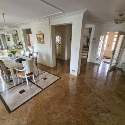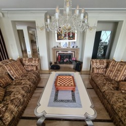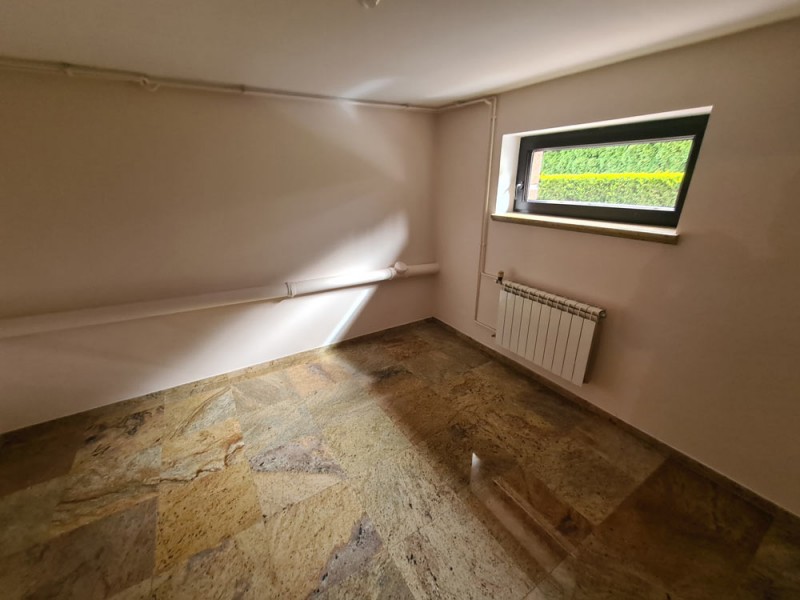 Na parterze znajduje się salon z kominkiem i wyjściem na taras i do ogrodu, kuchnia z jadalnią, dwie sypialnie, dwie łazienki oraz wiatrołap. Piętro obejmuje salon z kuchnią i barem, sypialnie, biuro, łazienkę, garderobę, skrytkę i balkon. W piwnicy mamy do dyspozycji siłownię, 1 pokój, przedpokój, pomieszczenie przygotowane na saunę, toaletę, pomieszczenie gospodarcze, skrytkę, kotłownię oraz dwu stanowiskowy, zamykany bramami uchylnymi garaż.
