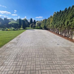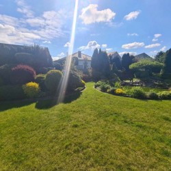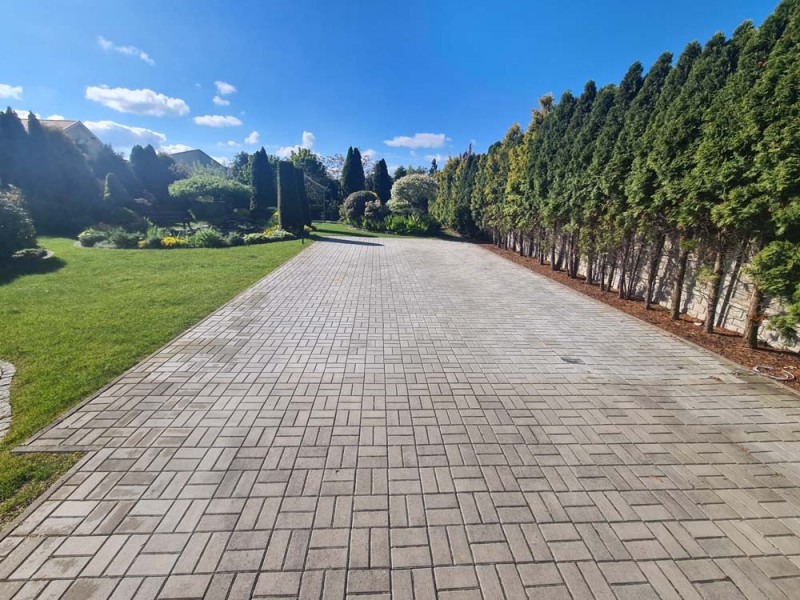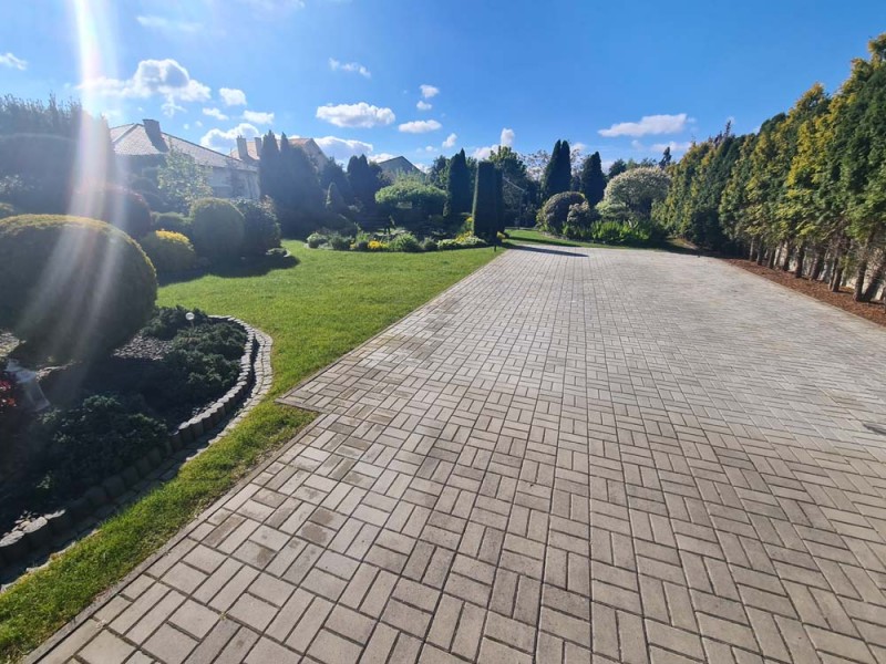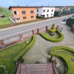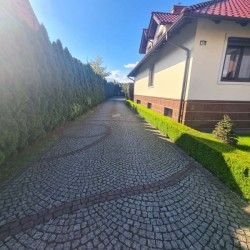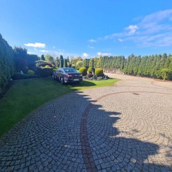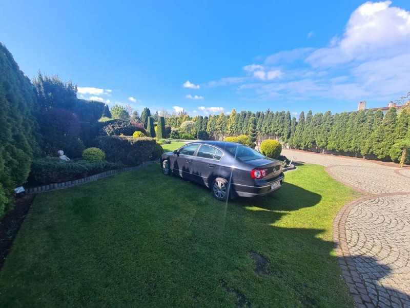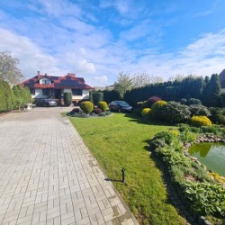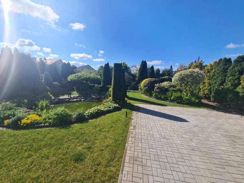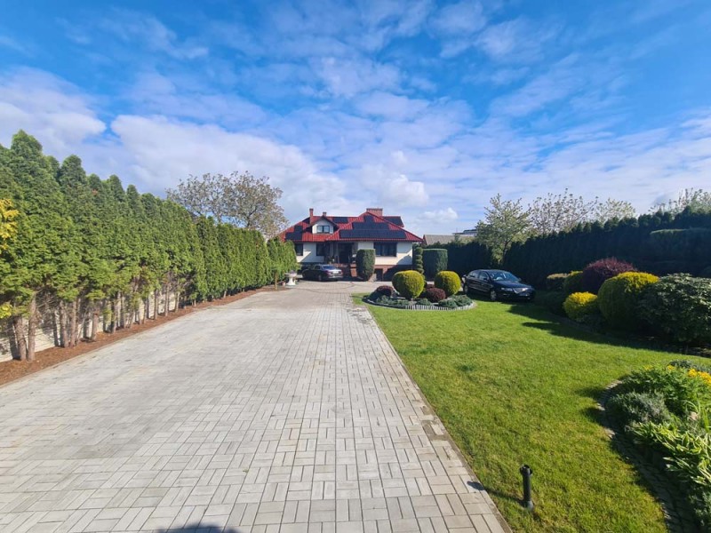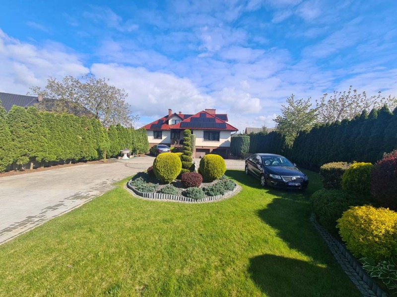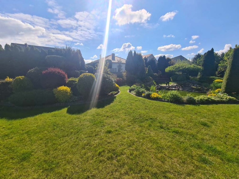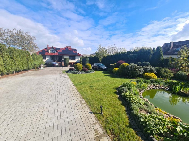 Działka otaczająca dom jest urządzona na podstawie projektu. Wjazd i chodnik został utwardzony kostką granitową. Ogród posiada studnię głębinową, liczne nasadzenia drzew i krzewów ozdobnych, a także drzew owocowych. Jest podlewany systemem automatycznego nawadniania a uroku dodaje znajdujące się w tyle posesji oczko wodne.