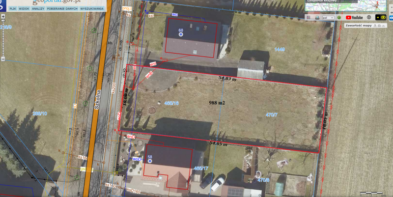 Działka nie została objęta miejscowym planem zagospodarowania przestrzennego. Została ogrodzona z każdej strony, wymiary: szerokość około 18 metrów, głębokość około 55 metrów. Front działki usytuowany jest od strony zachodniej. Media w ulicy: energia elektryczna, woda, gaz oraz kanalizacja.