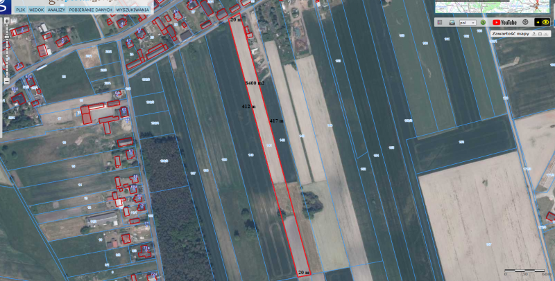 Łączna powierzchnia działek wynosi 9800 m2, nie zostały objęte miejscowym planem zagospodarowania przestrzennego. Na mniejszej działce znajduje się stodoła oraz posiada dojazd z dwóch stron. Media w ulicy asfaltowej: energia elektryczna, woda, kanalizacja, gaz na działce.