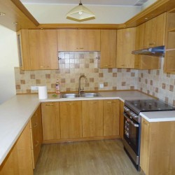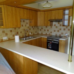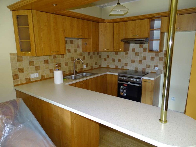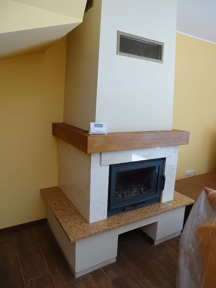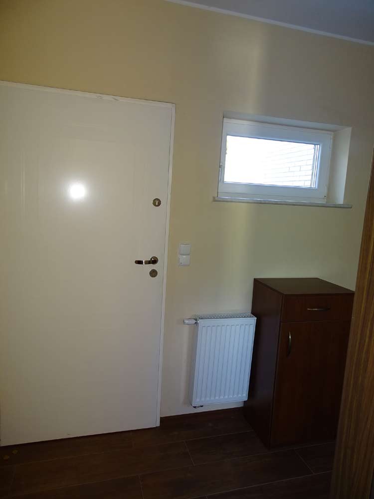 Okna PCV są w kolorze białym, wyposażone są w rolety zewnętrzne aluminiowe (roleta w salonie jest podnoszona elektrycznie). Podłogi wykończone są w kaflach ceramicznych i panelach. Kuchnie jest umeblowana meblami na wymiar, posiada sprzęt gospodarstwa domowego. Łazienka wykończona jest w płytkach ceramicznych, posiada prysznic, toaletę, umywalkę i szafkę łazienkową. Centralne ogrzewanie i wodę ciepłą zasila kocioł gazowy dwu funkcyjny firmy Ferroli, grzejniki są stalowe. Cena domu zawiera umeblowanie i wyposażenie kuchni, dwie pojemne szafy garderobianą na wymiar znajdującą się w wiatrołapie i garderobie. Pozostałe umeblowanie jest w opcji.