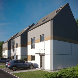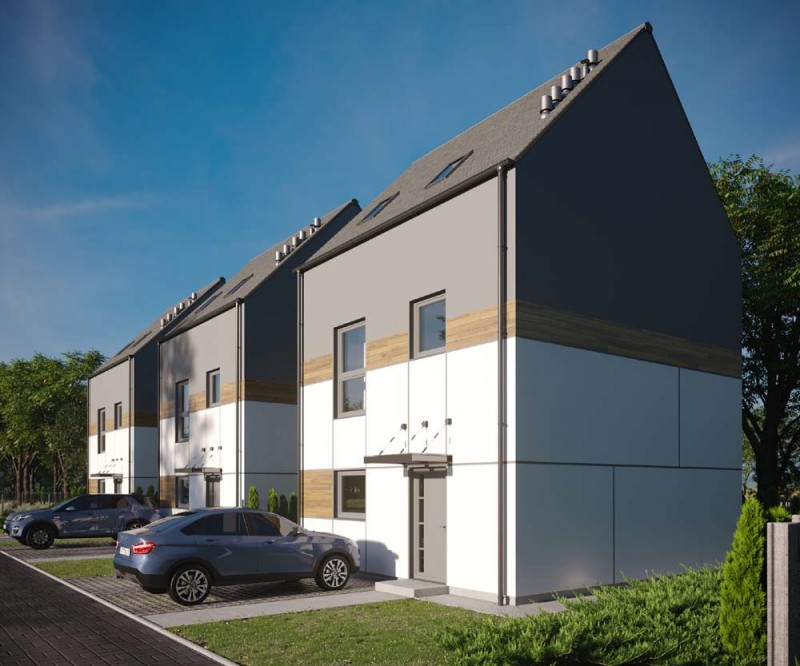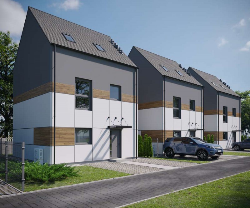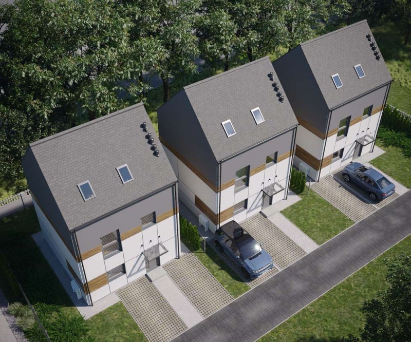 Zaprojektowano dachy skośne dla budynków, z odpowiednią wysokością attyki dającą możliwość montażu paneli fotowoltaicznych oraz zagospodarowania poddasza na cele mieszkalne
