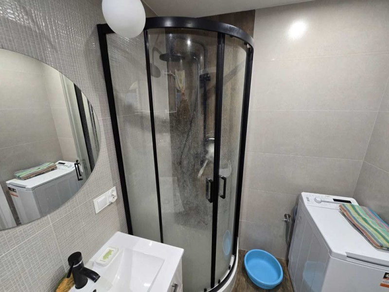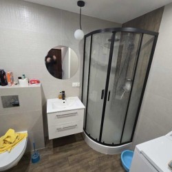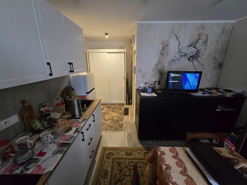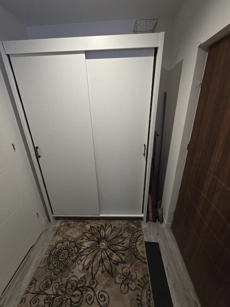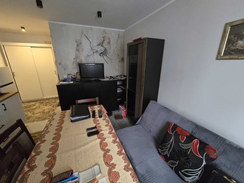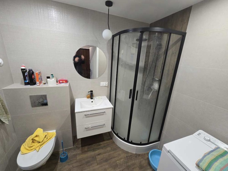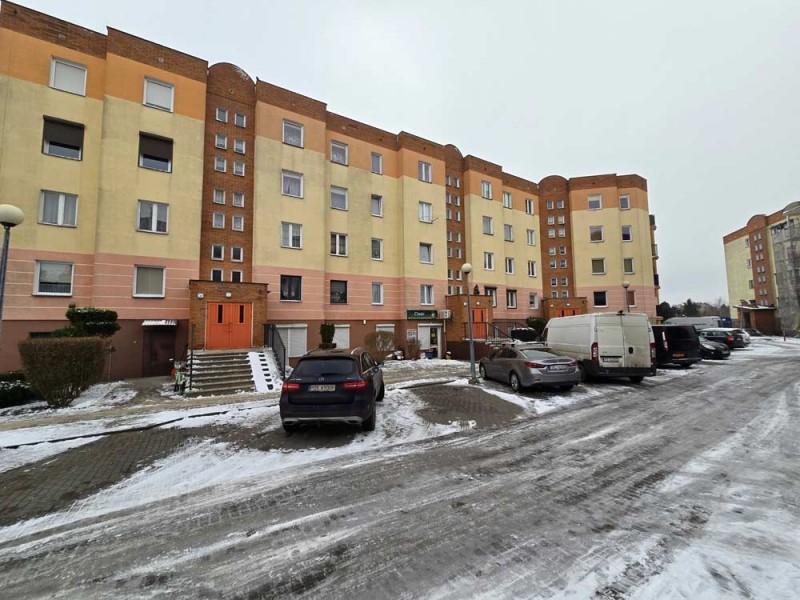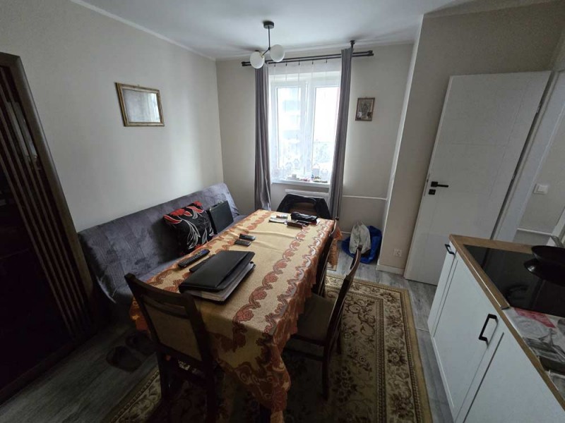 Wewnątrz mamy do dyspozycji salon połączony z kuchnią, sypialnię, łazienkę i przedpokój. Zamontowane są okna PCV a na podłogach znajdują się kafle ceramiczne i panele. Aneks kuchenny jest umeblowany, posiada płytę indukcyjną i pochłaniacz pary. Podłoga i ściany zostały wyłożone kaflami ceramicznymi, posiada ona kabinę prysznicową, geberit i umywalkę wraz z szafką. Centralne ogrzewanie i wodę ciepłą zasila ciepłownia miejska. Cena obejmuje umeblowanie i wyposażenie kuchni oraz dwie pojemne szafy garderobiane na wymiar znajdujące się w sypialni i przedpokoju.
