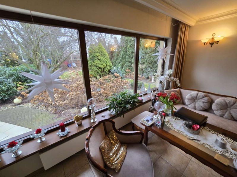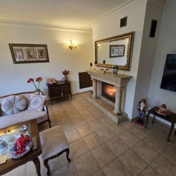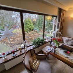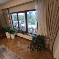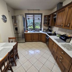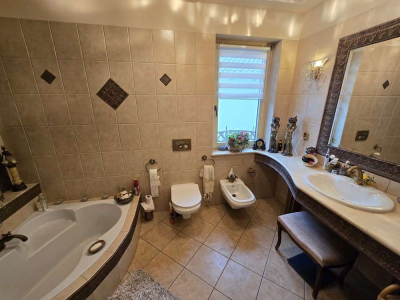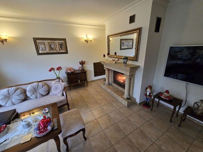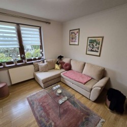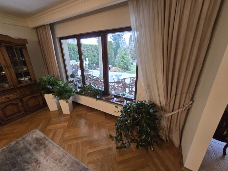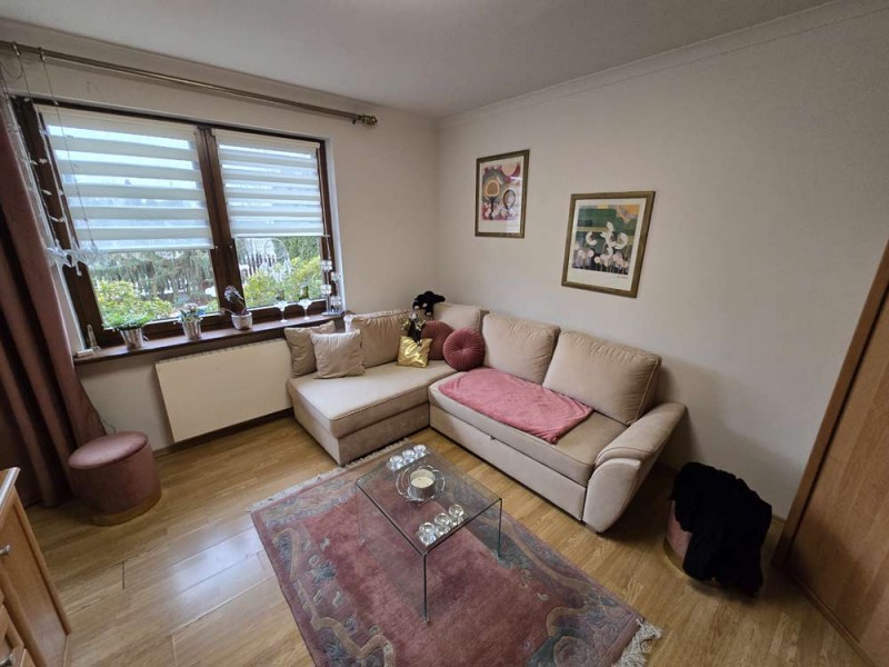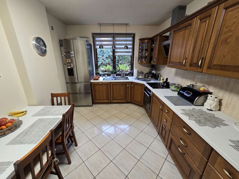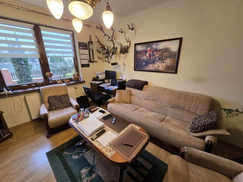 Dom jest przytulny, czysty i zadbany. Zamontowane są okna drewniane zespolone - dwu szybowe a na podłogach znajdują się parkiety dębowe i kafle ceramiczne. Ściany zostały pokryte gładzią szpachlową. Stolarka drzwiowa wewnętrzna została wykonana z drewna. Kuchnia jest umeblowana meblami na wymiar, posiada sprzęt gospodarstwa domowego. Łazienka jest wykończona w płytkach ceramicznych i tutaj do dyspozycji mamy wannę narożną, geberit, bidet i umywalkę. Kominek znajdujący się w salonie wyposażony został w grawitacyjne rozprowadzenie ciepła na pomieszczenia mieszkalne a centralne ogrzewanie i wodę ciepłą zasila kocioł gazowy dwu funkcyjny, grzejniki są stalowe. Spore oszczędności energii elektrycznej zapewnia instalacja fotowoltaiczna o mocy 3,20 kW znajdująca się na dachu budynku. Cena obejmuje zabudowę trwałą - meble kuchenne wraz ze sprzętem agd oraz pojemną szafę garderobianą na wymiar znajdującą się w korytarzu. Pozostałe umeblowanie jest w opcji.