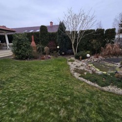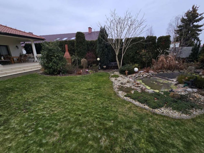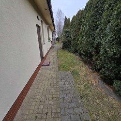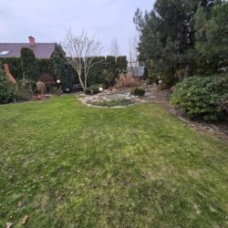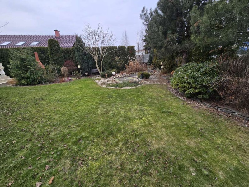 Działka jest ogrodzona i pięknie zagospodarowana, jej front został ogrodzony płotem drewnianym na podmurówce klinkierowej a posesja jest zamykana bramą sterowaną zdalnie. Wjazd i chodnik zostały utwardzone betonową kostką. Urządzony jest ogród z nasadzeniami drzew i krzewów ozdobnych. Uroku dodaje wkomponowane w przestrzeń ogrodu ozdobne oczko wodne i fontanna. Na działce znajduje się wiata na drewno kominkowe.