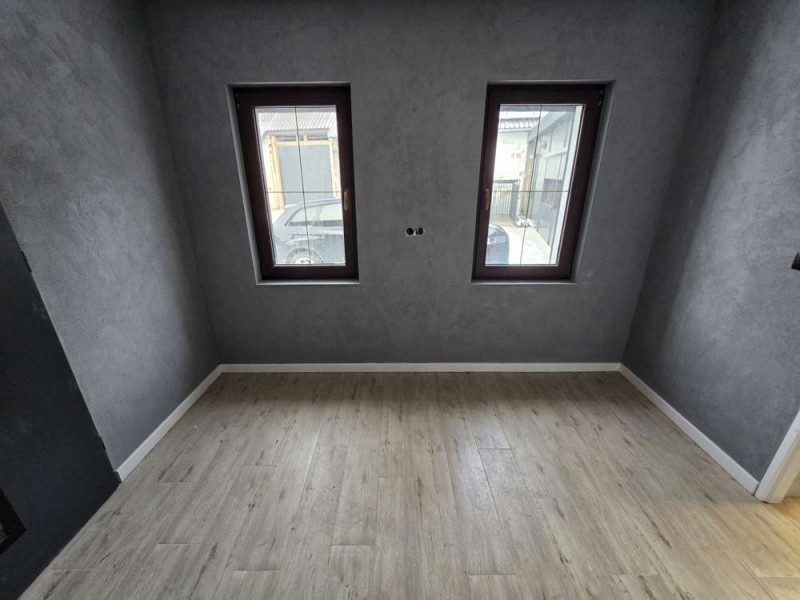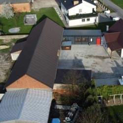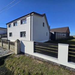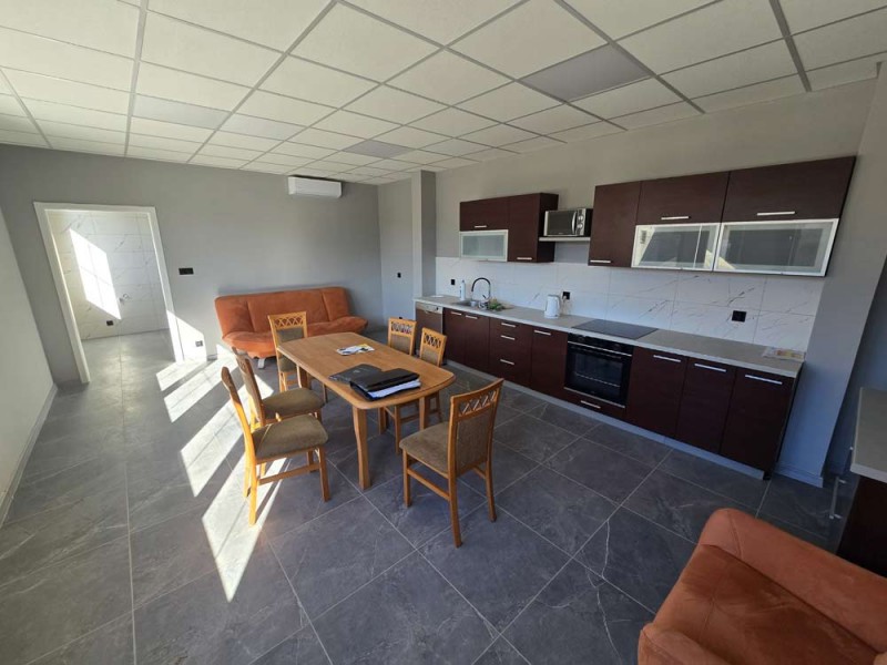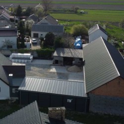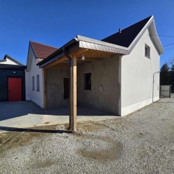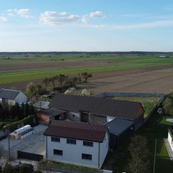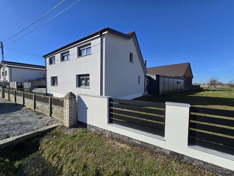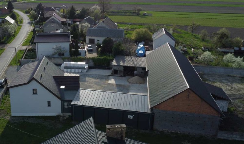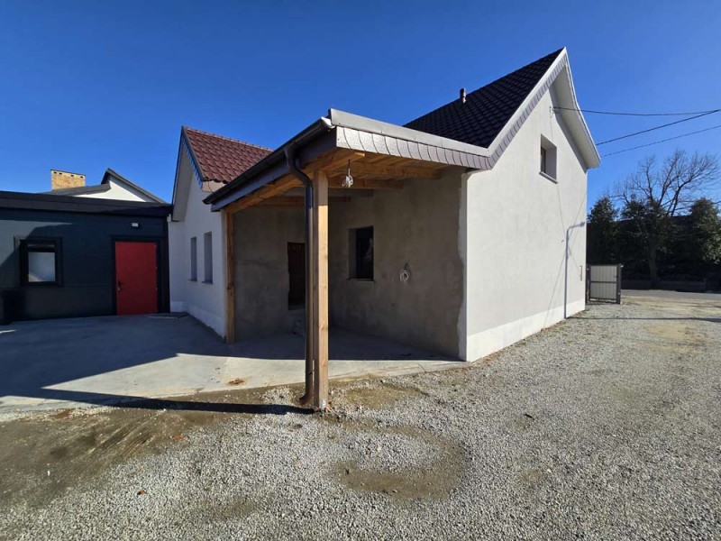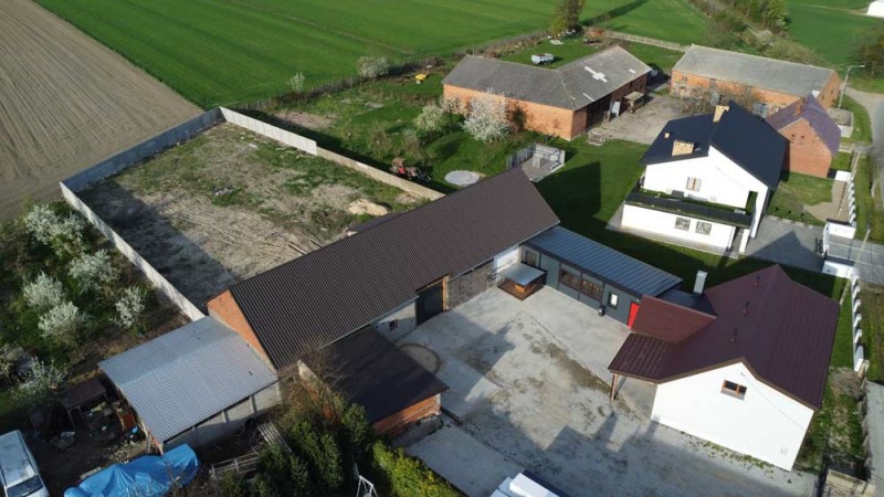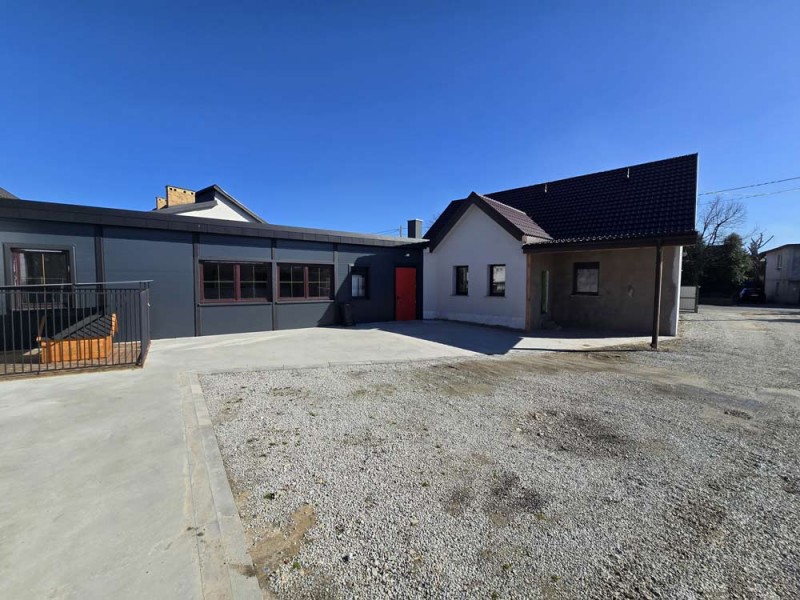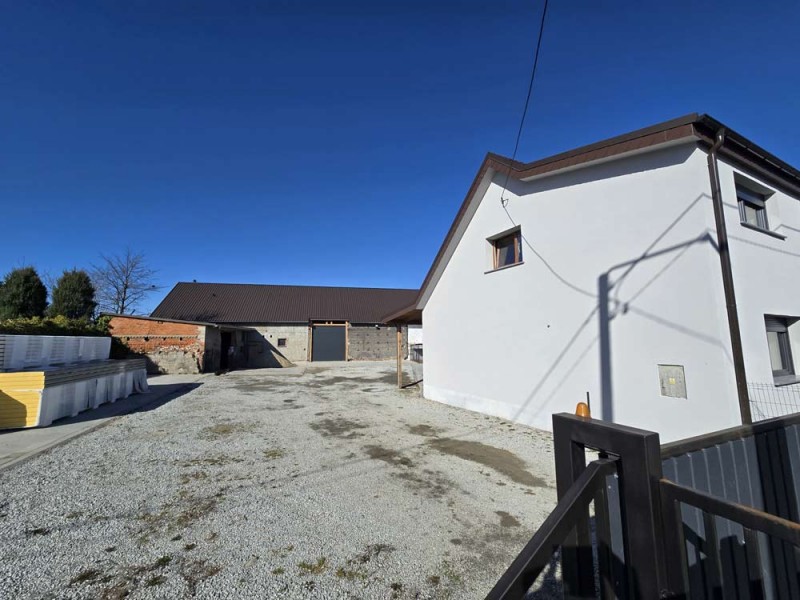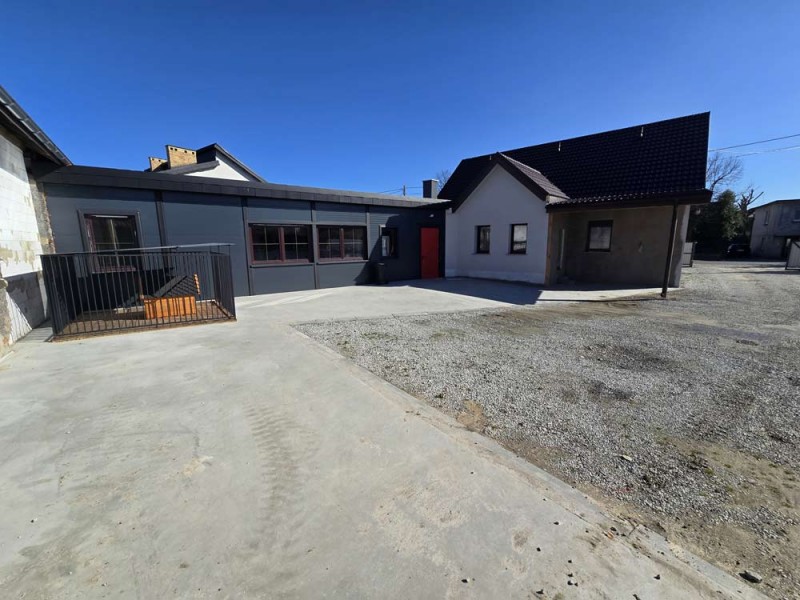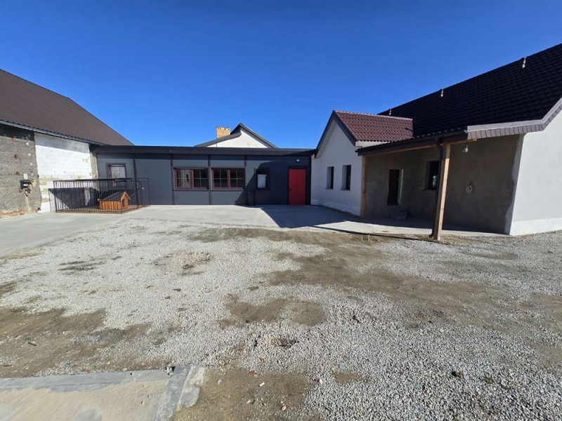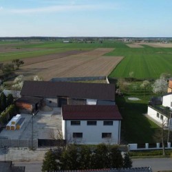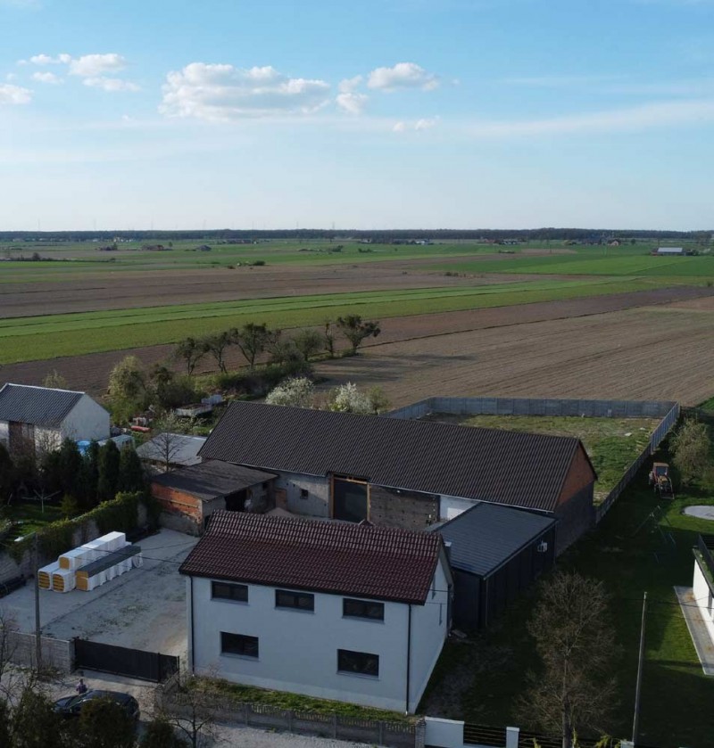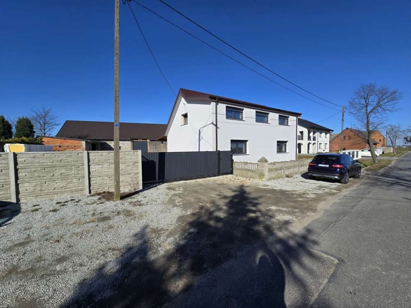 Na parterze znajduje się salon, kuchnia, pokój i łazienka a piętro obejmuje trzy pokoje i drugą łazienkę (pomieszczenia te są do adaptacji). Centralne ogrzewanie zasila piec na pellet z zasobnikiem wody. Drugi z budynków to budynek o powierzchni 90 m2 składający się z kuchni, łazienki, pomieszczenia gospodarczego i kotłowni. Materiałem budowy jest płyta obornicka i płyta osb. Pomieszczenia te są klimatyzowane. Zainstalowana jest instalacja fotowoltaiczna o mocy 10 kW oraz pompa ciepła z magazynem energii.