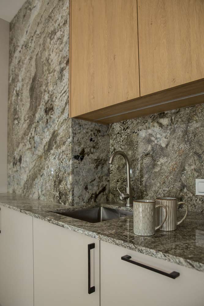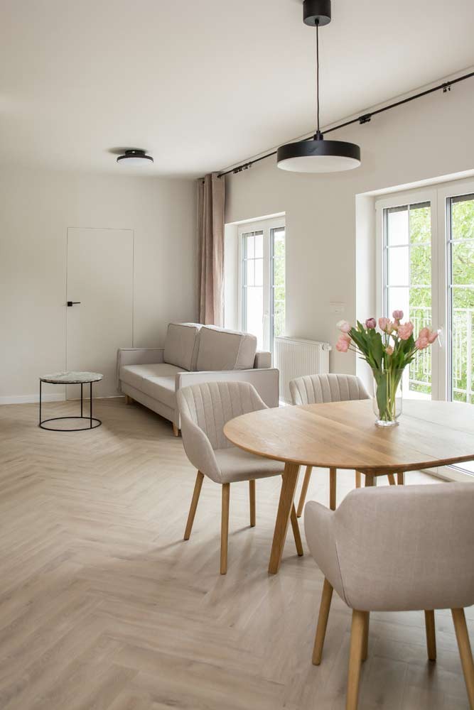 Materiały użyte do wykończenia wnętrza są wysokiej jakości, lokal jest utrzymany w wysokim standardzie. Zamontowane są okna z profili PCV. Ze względów użytkowych i estetycznych podłogi zostały pokryte panelami i wielkoformatowymi kaflami ceramicznymi. Ściany są gipsowane. Kuchnia została umeblowana meblami na wymiar, wyposażono ją w sprzęt gospodarstwa domowego – lodówkę, płytę indukcyjną, piekarnik elektryczny, zmywarkę i pochłaniacz pary. Salon jest klimatyzowany. Łazienka jest wykończona w płytkach ceramicznych, posiada prysznic geberit, umywalkę wraz z szafką oraz pralkę automatyczną. Centralne ogrzewanie i wodę ciepłą kocioł gazowy dwu funkcyjny, grzejniki są stalowe. Cena obejmuje zabudowę trwałą – meble kuchenne wraz ze sprzętem agd oraz pozostałe umeblowanie i wyposażenie.