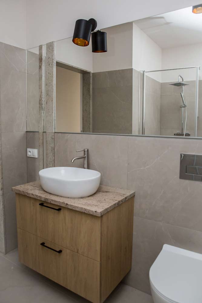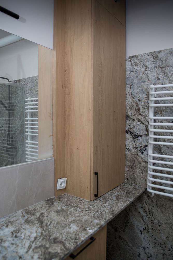 Materiały użyte do wykończenia wnętrza są wysokiej jakości, lokal jest utrzymany w wysokim standardzie. Zamontowane są okna z profili PCV. Ze względów użytkowych i estetycznych podłogi zostały pokryte panelami i wielkoformatowymi kaflami ceramicznymi. Ściany są gipsowane. Kuchnia została umeblowana meblami na wymiar, wyposażono ją w sprzęt gospodarstwa domowego – lodówkę, płytę indukcyjną, piekarnik elektryczny, zmywarkę i pochłaniacz pary. Salon jest klimatyzowany. Łazienka jest wykończona w płytkach ceramicznych, posiada prysznic geberit, umywalkę wraz z szafką oraz pralkę automatyczną. Centralne ogrzewanie i wodę ciepłą kocioł gazowy dwu funkcyjny, grzejniki są stalowe. Cena obejmuje zabudowę trwałą – meble kuchenne wraz ze sprzętem agd oraz pozostałe umeblowanie i wyposażenie.