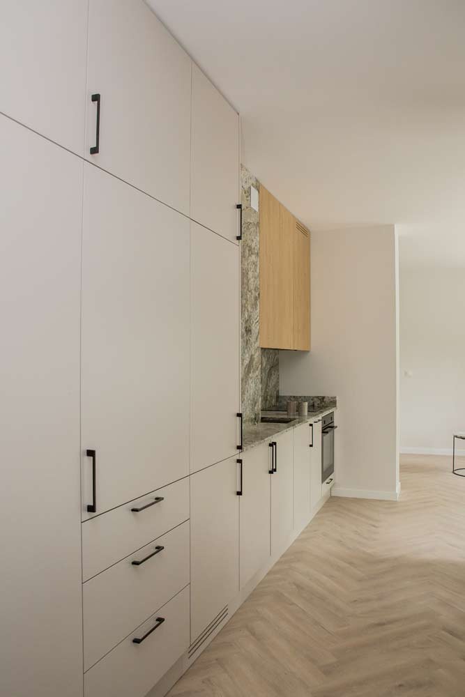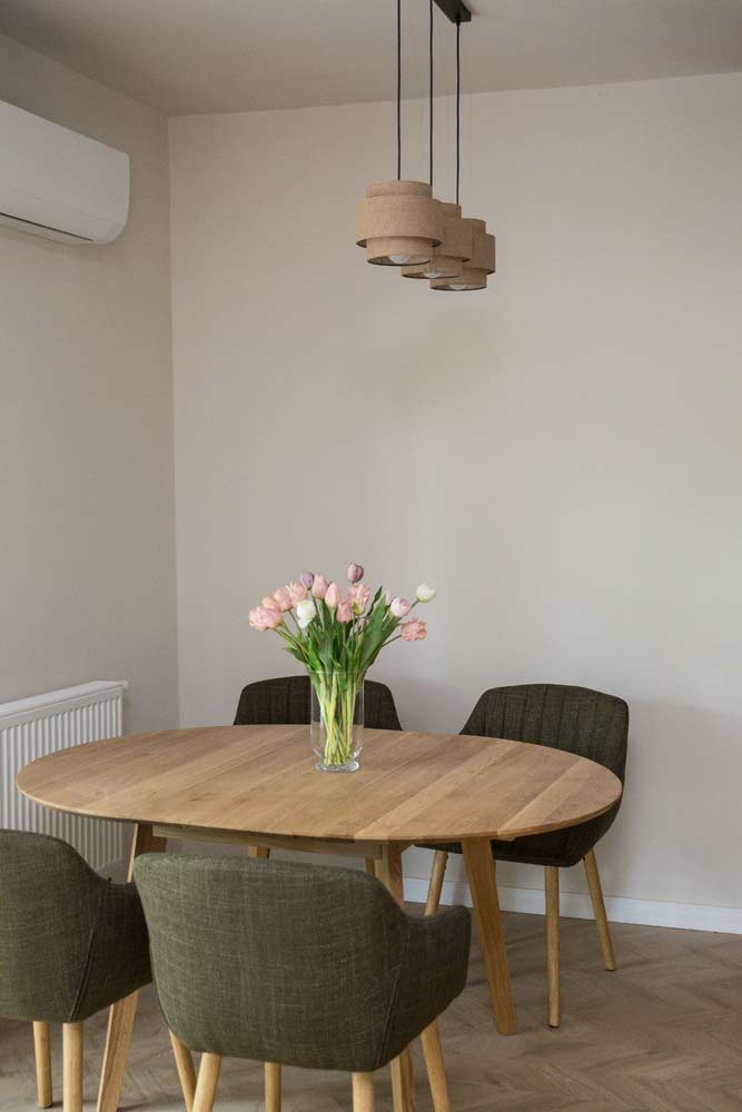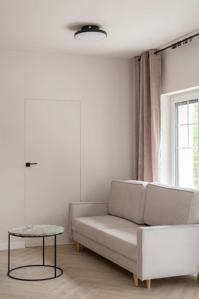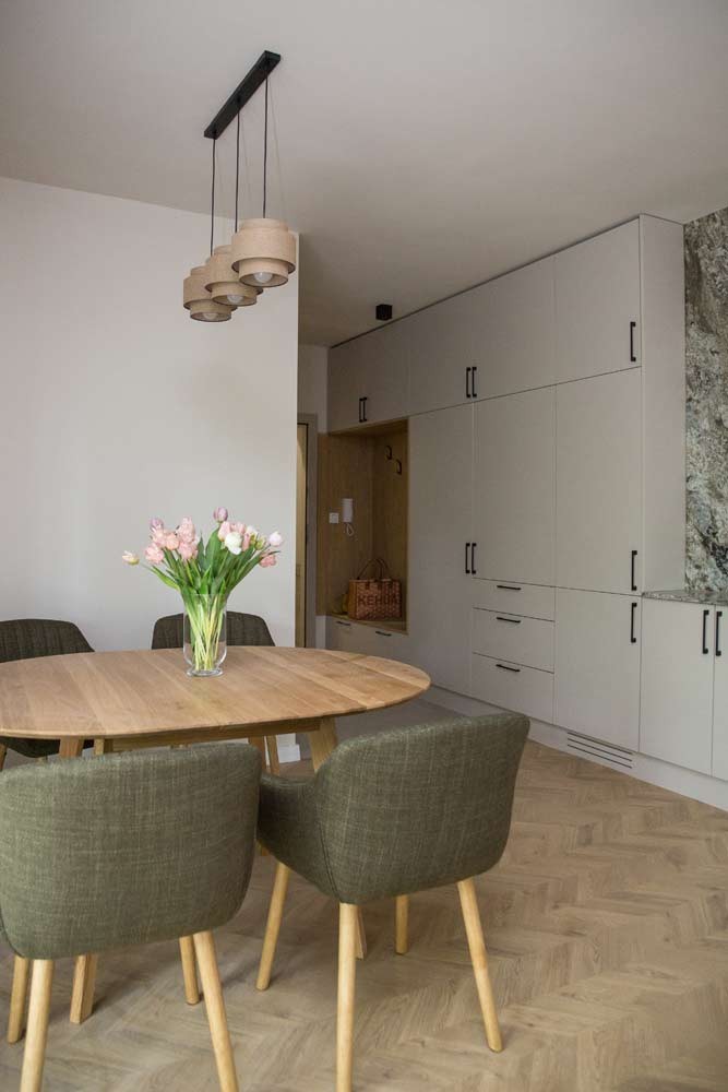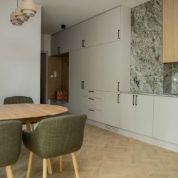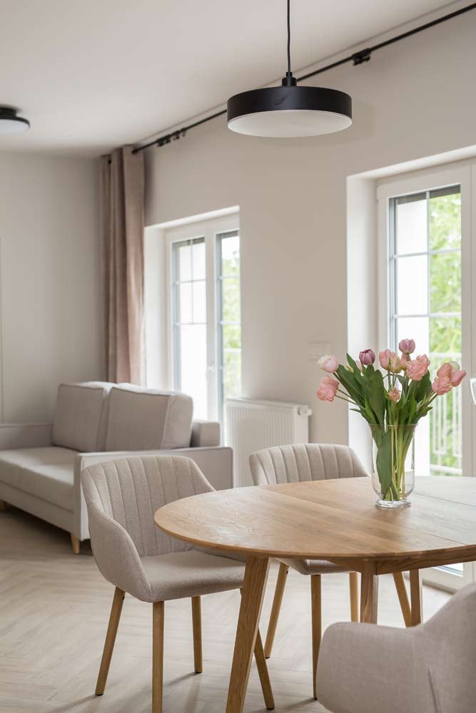 Materiały użyte do wykończenia wnętrza są wysokiej jakości, lokal jest utrzymany w wysokim standardzie. Zamontowane są okna z profili PCV. Ze względów użytkowych i estetycznych podłogi zostały pokryte panelami i wielkoformatowymi kaflami ceramicznymi. Ściany są gipsowane. Kuchnia została umeblowana meblami na wymiar, wyposażono ją w sprzęt gospodarstwa domowego – lodówkę, płytę indukcyjną, piekarnik elektryczny, zmywarkę i pochłaniacz pary. Salon jest klimatyzowany. Łazienka jest wykończona w płytkach ceramicznych, posiada prysznic geberit, umywalkę wraz z szafką oraz pralkę automatyczną. Centralne ogrzewanie i wodę ciepłą kocioł gazowy dwu funkcyjny, grzejniki są stalowe. Cena obejmuje zabudowę trwałą – meble kuchenne wraz ze sprzętem agd oraz pozostałe umeblowanie i wyposażenie.