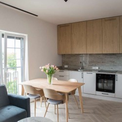 Lokal ten stanowi odrębną własność z udziałem w gruncie i księgą wieczystą a jego powierzchnia użytkowa wynosi 43,93 m2. Mieszkanie jest położone na drugim piętrze. Układ pomieszczeń został zaprojektowany w sposób nowoczesny i przestrzenny. Wewnątrz mamy do dyspozycji pokój dzienny z aneksem kuchennym, jedną sypialnię, łazienkę, korytarz oraz balkon o pow. 6,47 m2.