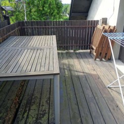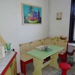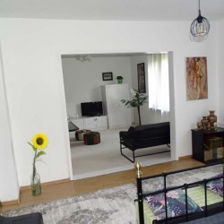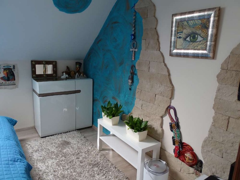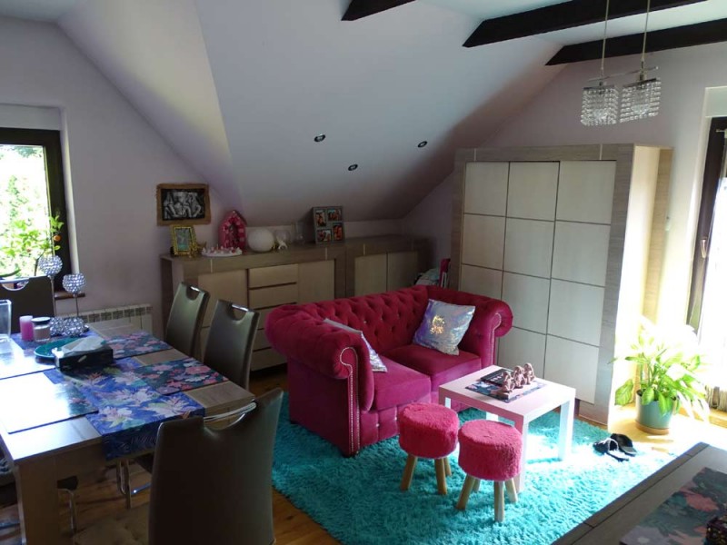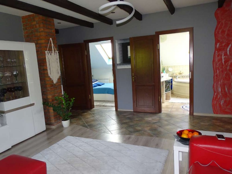 Parter domu posiada powierzchnię około 110 m2, składa się z trzech pokoi (dwa z nich są otwarte) oraz kuchni i łazienki. Piętro obejmuje drugie mieszkanie o powierzchni 85 m2 i tutaj mamy do dyspozycji salon z aneksem kuchennym, trzy sypialnie, łazienkę oraz balkon. Schody łączące obie te kondygnacje są betonowe a stopnie zostały wykończone drewnem. Dom jest również podpiwniczony a piętro jest klimatyzowane.