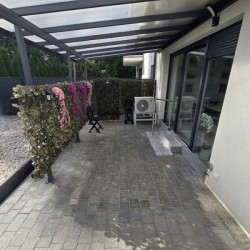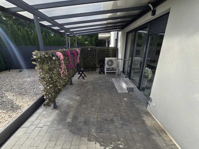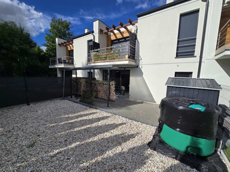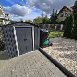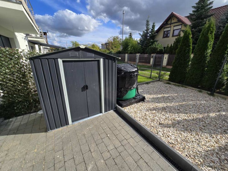 Teren wokół budynku został zagospodarowany, podjazd i chodnik utwardzony został ozdobną kostką. Na terenie ogródka znajduje się domek narzędziowy oraz zbiornik na deszczówkę.