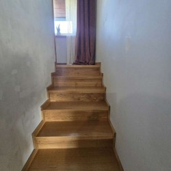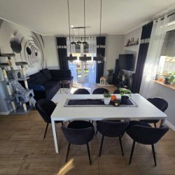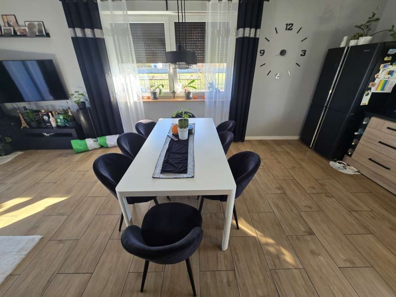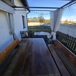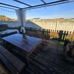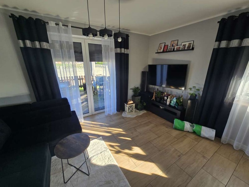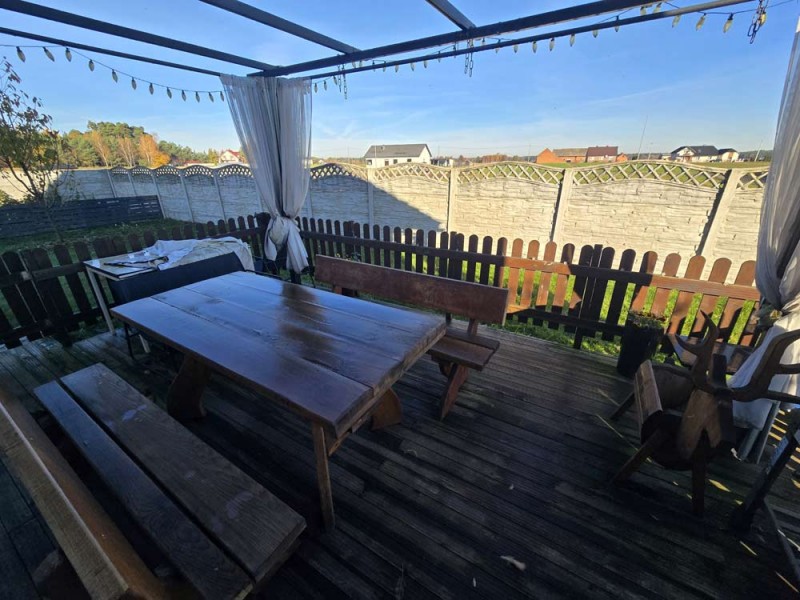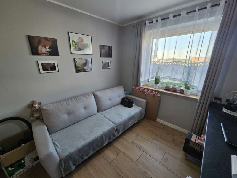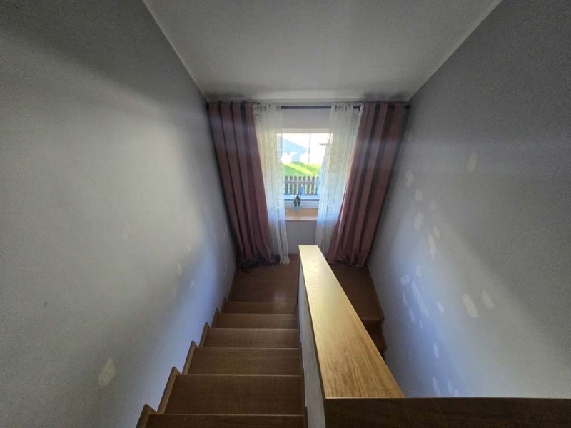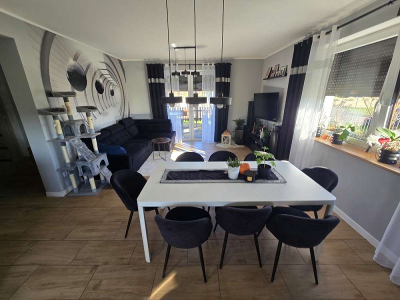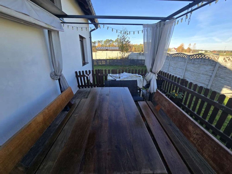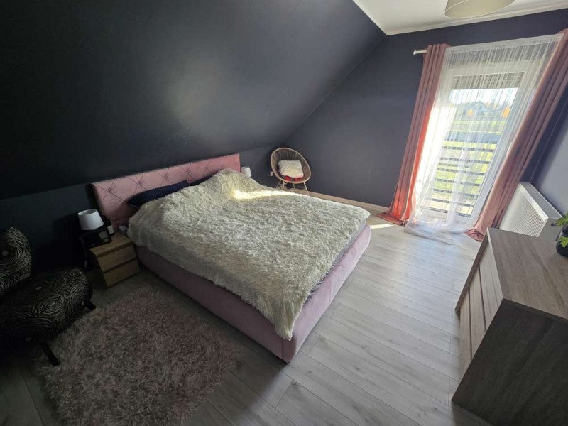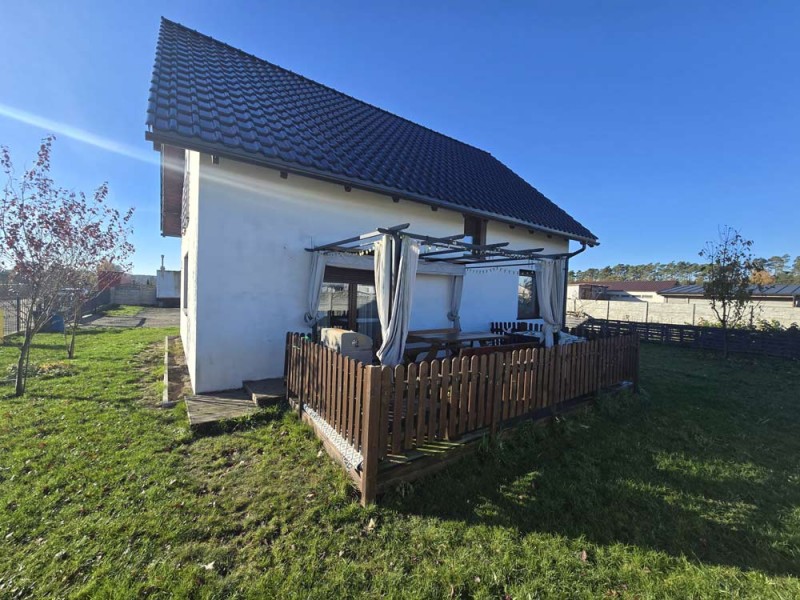 Dom jest w bardzo dobrym stanie technicznym i nie wymaga żadnych nakładów finansowych, został nowocześnie i przytulnie urządzony. Na parterze znajduje się salon z aneksem kuchennym i wyjściem na zadaszony taras, pokój, łazienka i pomieszczenie gospodarcze. Piętro obejmuje trzy sypialnie oraz drugą łazienkę. Obie te kondygnacje łączy przestrzenna, której stopnie zostały wykonane z drewna.