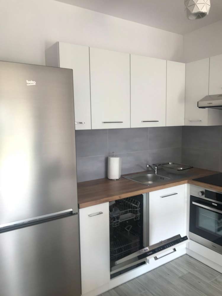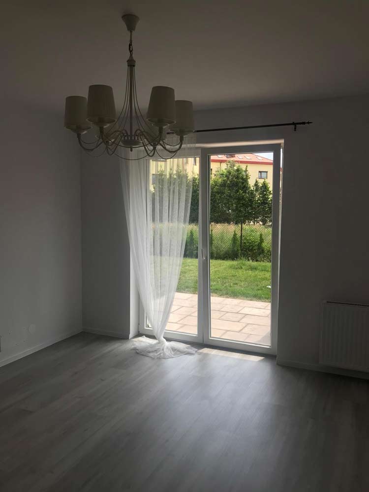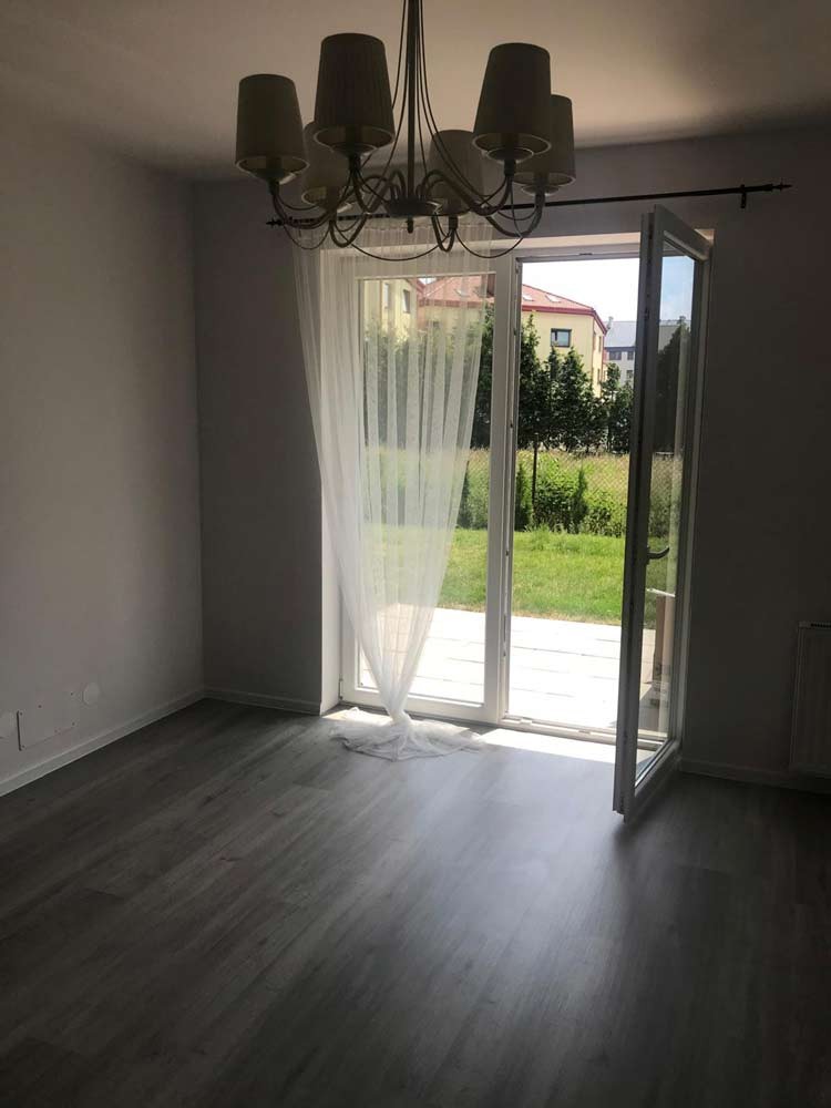 W lokalu zamontowane zostały okna PCV a na podłogach znajdują się kafle ceramiczne i panele. Ściany zostały pokryte gładzią gipsową. Kuchnia jest umeblowana meblami na wymiar, została wyposażona w sprzęt gospodarstwa domowego - płytę indukcyjną, lodówko - zamrażarkę, zmywarkę, piekarnik i pochłaniacz pary. Łazienka wykończona jest w kaflach ceramicznych, posiada kabinę prysznicową, geberit i umywalkę wraz z szafką. Centralne ogrzewanie i wodę ciepłą zasila nowoczesna kotłownia gazowa dostarczająca ciepło do każdego z mieszkań. Cena obejmuje zabudowę trwałą - meble kuchenne wraz z wyposażeniem agd, szafę garderobianą znajdującą się w przedpokoju.