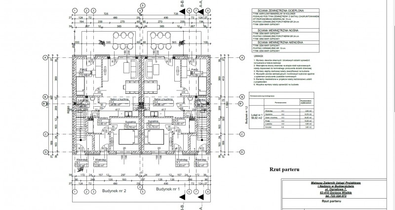 Każdy segment składa się z dwóch lokali mieszkalnych (jednego na parterze i jednego na piętrze). Są one usytuowane od strony północnej i południowej. Niezależne wejścia do lokali zaprojektowano w elewacji frontowej każdego z segmentów. Do lokalu na piętrze prowadzi wydzielona klatka schodowa dostępna bezpośrednio z zewnątrz budynku, w celu zapewnienia Państwu prywatności. Budynek jest budynkiem piętrowym, niepodpiwniczonym, przykrytym dachem płaskim. Materiałem budowy jest pustak ceramiczny, który zostanie docieplony zewnętrznie styropianem i pokryty tynkiem. Ściany wewnętrzne będą wykończone tynkiem maszynowym. Mieszkania wyposażone zostaną w rolety zewnętrzne aluminiowe i drzwi antywłamaniowe, w celu zwiększenia Państwa komfortu i bezpieczeństwa oraz okna z profili PCV - 3 szybowe. Do każdego lokalu mieszkalnego przynależy jedno miejsce parkingowe przed wejściem do budynku.