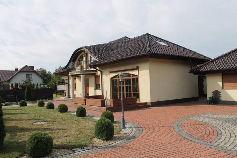 Łazienki zostały wykończone w kaflach ceramicznych. W jednej z nich znajduje się wanna, w drugiej łazience na parterze- kabina prysznicowa. Wysokiej klasy okna wykonane zostały z drewna dębowego, posiadają rolety zewnętrzne aluminiowe - antywłamaniowe. Duża roleta w salonie sterowana jest elektrycznie. Na podłogach znajdują się kafle ceramiczne, wykładziny oraz deska barlinecka. Ściany gipsowane, podwieszane sufity posiadają oświetlenie ledowe . Stolarka drzwiowa wewnętrzna firmy Porta a drzwi wejściowe z drewna dębowego wykonane na zamówienie. W budynku znajduje się centralny system odkurzania, nowoczesny system alarmowy oraz klimatyzacja. Materiały użyte do wykończenia wnętrza domu są najwyższej jakości.