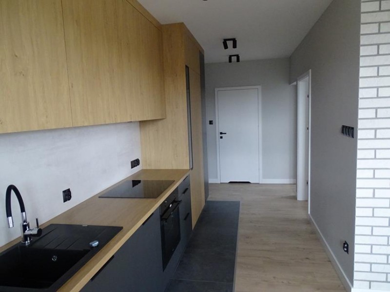 Mieszkanie jest nowe, posiada powierzchnię 47,10 m2 i składa się z pokoju dziennego połączonego z aneksem kuchennym, dwóch sypialni, łazienki oraz przedpokoju. Kuchnia została umeblowana meblami na wymiar i wyposażona w płytę indukcyjną, piekarnik, zmywarkę, lodówko-zamrażarkę, zlewozmywak oraz pochłaniacz powietrza. Pokoje w mieszkaniu są puste. Łazienkę wykończono płytkami ceramicznymi i wyposażono w kabinę prysznicową, umywalkę wraz z szafką oraz geberit. Do mieszkania przynależy jedno miejsce postojowe, oraz komórka lokatorska.