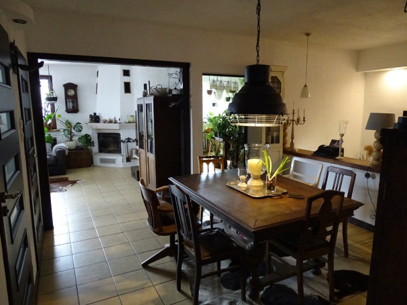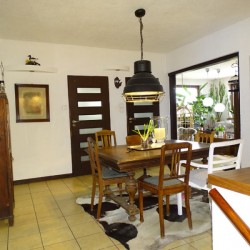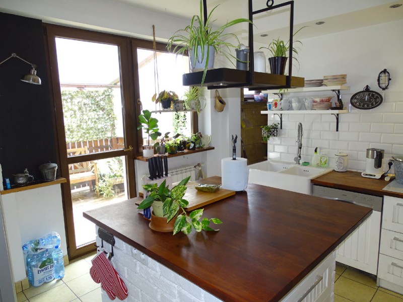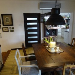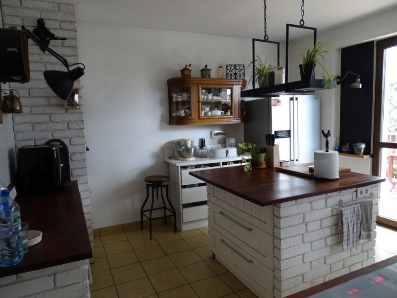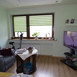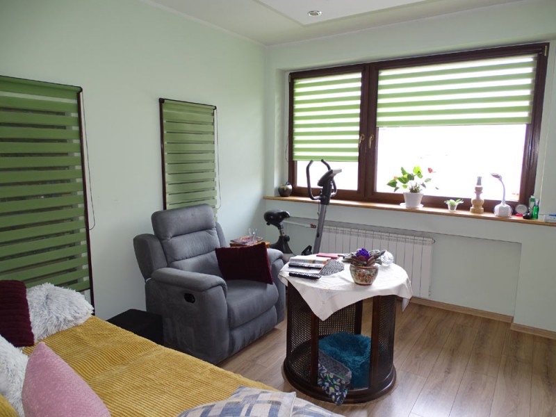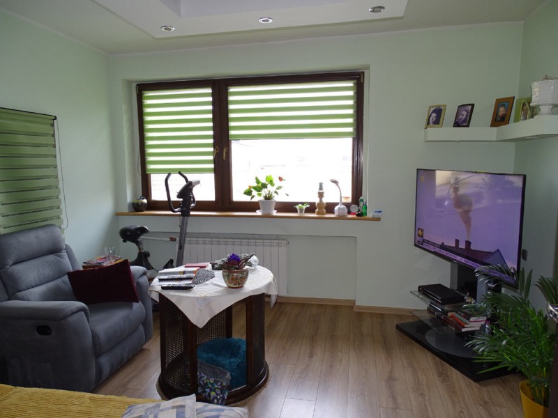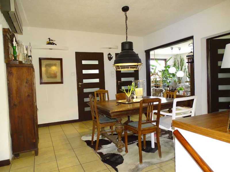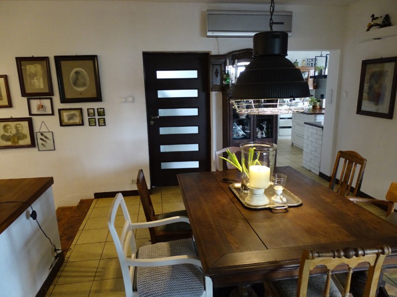 W domu zamontowane są okna z profili PCV w okleinie drewnopodobnej na podłogach znajduje się parkiet, panele i kafle ceramiczne. Ściany są gipsowane a stolarka drzwiowa wewnętrzna jest wykonana z drewna. Stylowa, widna kuchnia z wyspą jest umeblowana meblami na wymiar, posiada sprzęt gospodarstwa domowego - zmywarkę, płytę indukcyjną. Łazienka z oknem została wykończona w płytkach ceramicznych, zamontowano w niej kabinę prysznicową. Toaleta jest osobna. Centralne ogrzewanie zasila piec stałocieplny na miał, instalacja jest stalowa a grzejniki aluminiowe i żeliwne. Budynek wyposażony jest w klimatyzator. Na tarasie posiadającym zejście do ogrodu zostało urządzone przytulne miejsce na wypoczynek i rekreację. Cena obejmuje umeblowanie i wyposażenie kuchni a pozostałe meble są w opcji. Dom jest w bardzo dobrym stanie technicznym i nie wymaga nakładów finansowych, jest na bieżąco modernizowany i konserwowany.