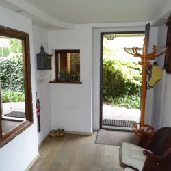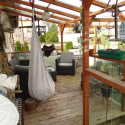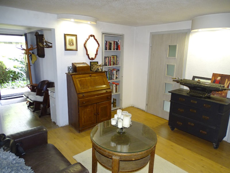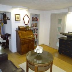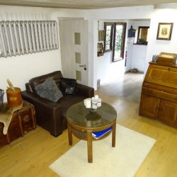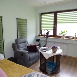 W przyziemiu mieszkalnym znajduje się holl, 2 sypialnie, garderoba, korytarz oraz zaplecze gospodarcze - pralnia i kotłownia. Druga kondygnacja - wysoki parter obejmuje salon z kominkiem, dwie kolejne sypialnie, kuchnię ze spiżarnią, łazienkę, toaletę, holl, balkon oraz duży zadaszony markizą taras. Trzecia kondygnacja to nieużytkowe poddasze.