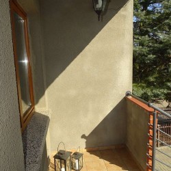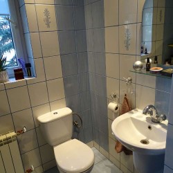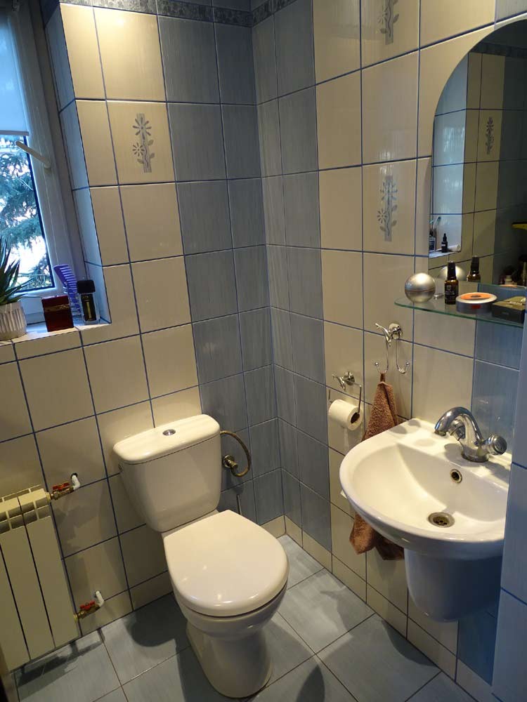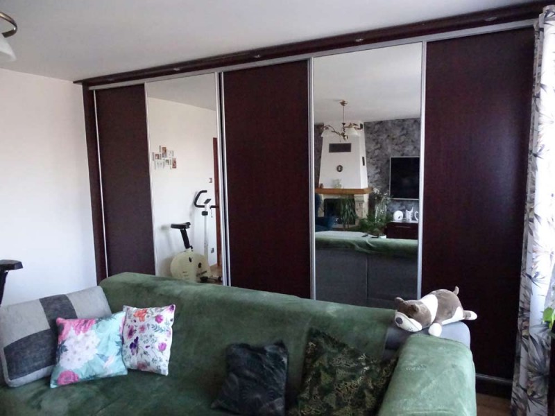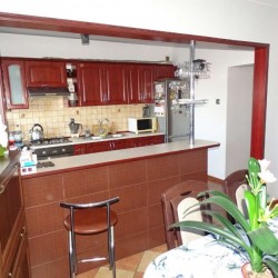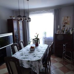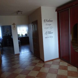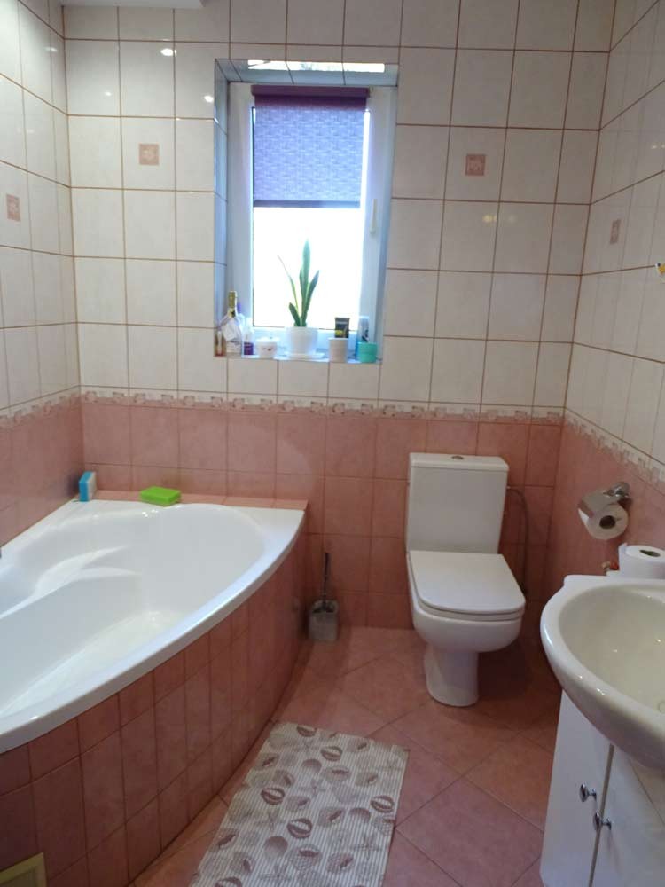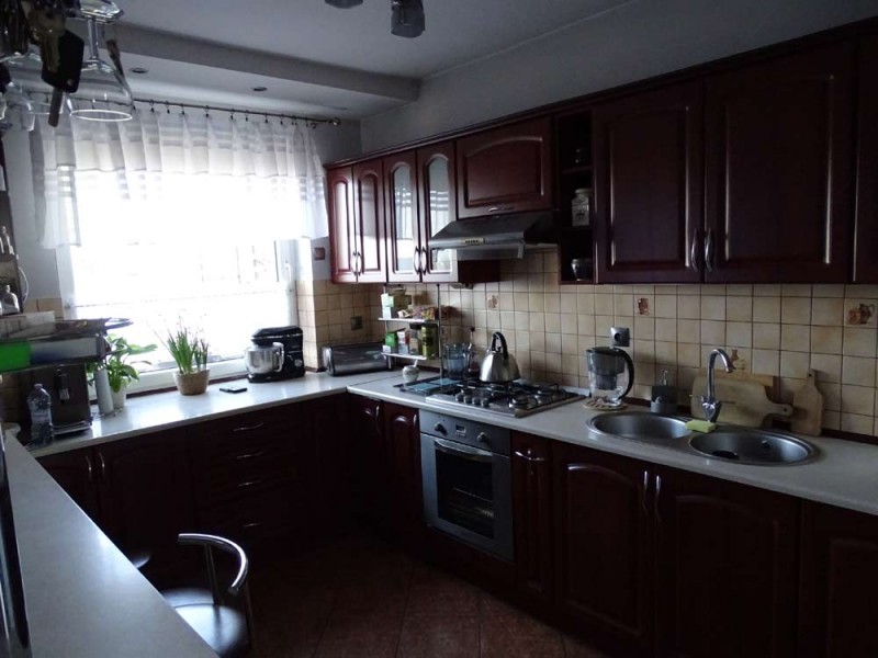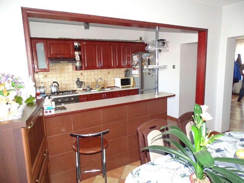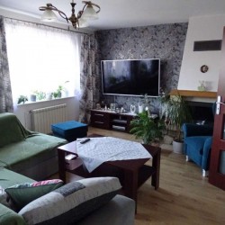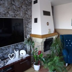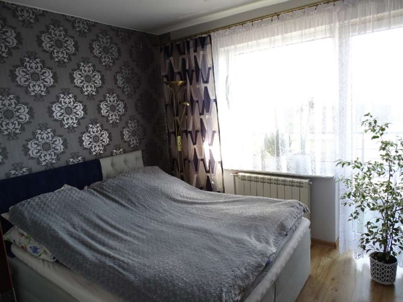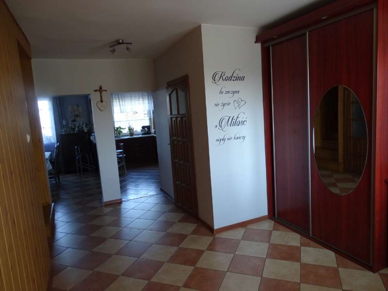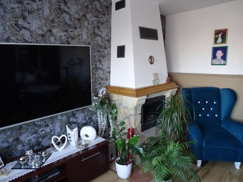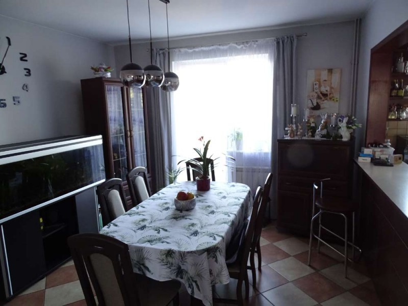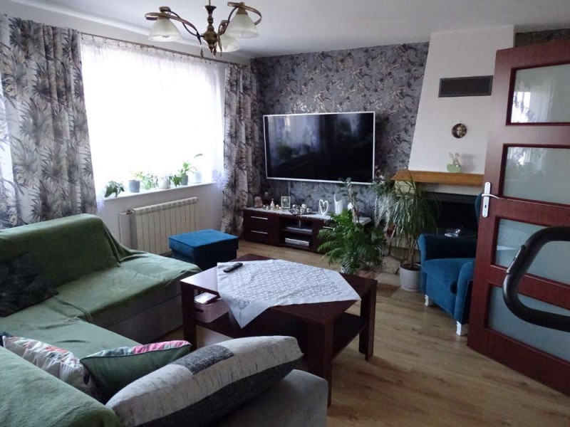 Dom jest przytulnie urządzony, czysty i zadbany. Zamontowane są okna z profili PCV a ściany zostały pokryte gładzią szpachlową. Stolarka drzwiowa wewnętrzna jest wykonana z drewna a na podłogach znajdują się panele i płytki ceramiczne. Półotwarta kuchnia została umeblowana meblami na wymiar, wyposażono ją w kuchenkę gazową z piekarnikiem elektrycznym, zmywarkę i pochłaniacz pary. Podłogi i ściany obu łazienek zostały wyłożone płytkami ceramicznymi, w jednej łazience zamontowano wannę a w drugiej prysznic. Centralne ogrzewanie zasila piec na eko groszek z podajnikiem, instalacja jest miedziana a grzejniki aluminiowe.