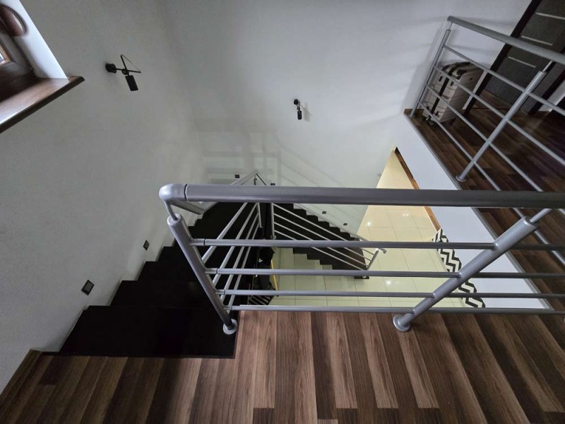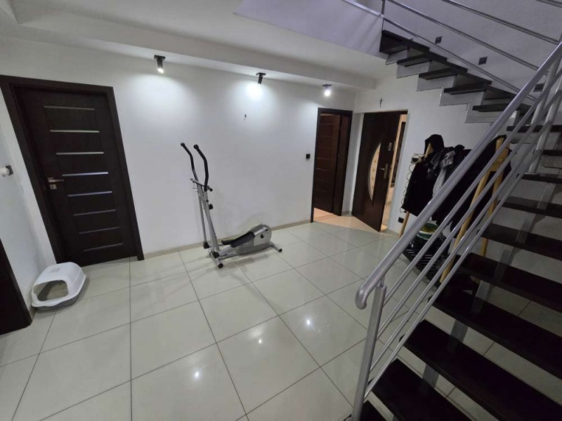 Na parterze znajduje się obszerny salon z wyjściem na zadaszony taras, aneks kuchenny posiadający również swój taras, pokój, łazienka, holl, kotłownia oraz duży garaż o powierzchni 70 m2. Piętro obejmuje trzy sypialnie, garderobę, pralnię oraz trzy balkony. Obie te kondygnacje łączy przestrzenna klatka schodowa, której stopnie wykończono drewnem.