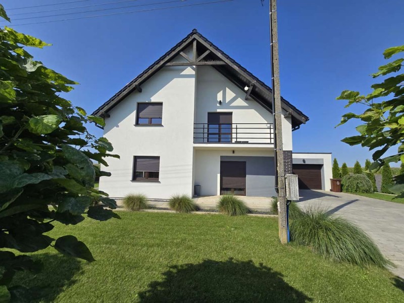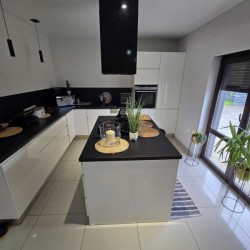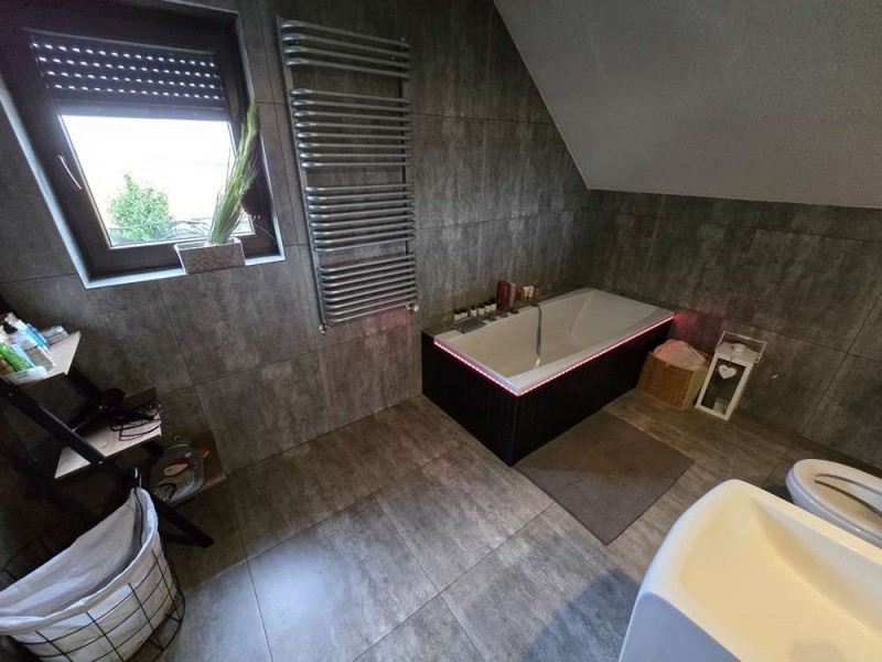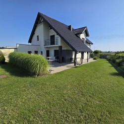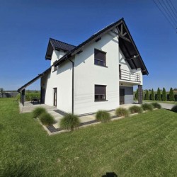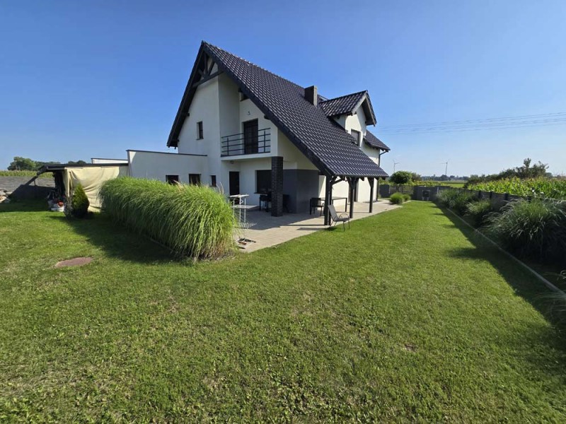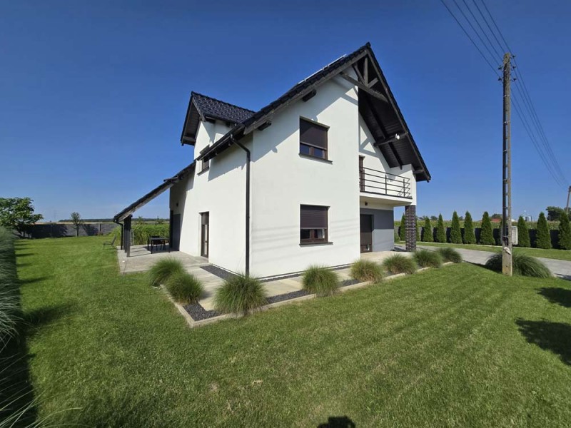 Zamontowane są okna z profili PCV z roletami aluminiowymi zewnętrznymi z napędem elektrycznym. Z uwagi na walory użytkowe i estetyczne podłogi wyłożono panelami i kaflami ceramicznymi. Ściany zostały pokryte gładzią gipsową. Widna kuchnia została umeblowana meblami na wymiar, posiada wyspę, wyposażono ją w zabudowany sprzęt gospodarstwa domowego - lodówkę, płytę gazową, piekarnik elektryczny, zmywarkę i pochłaniacz pary. Obie łazienki są wykończone w płytkach ceramicznych, łazienka na parterze posiada prysznic a w łazience na piętrze mamy do dyspozycji wannę. Centralne ogrzewanie zasila kocioł gazowy dwu funkcyjny. Cena obejmuje zabudowę trwałą - meble kuchenne wraz z zabudowanym sprzętem agd oraz cztery pojemne szafy garderobiane na wymiar. Pozostałe umeblowanie i wyposażenie jest w opcji.