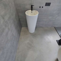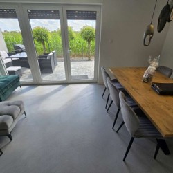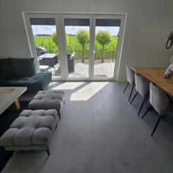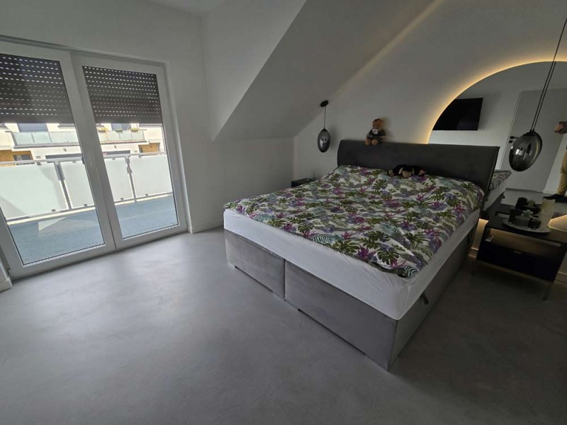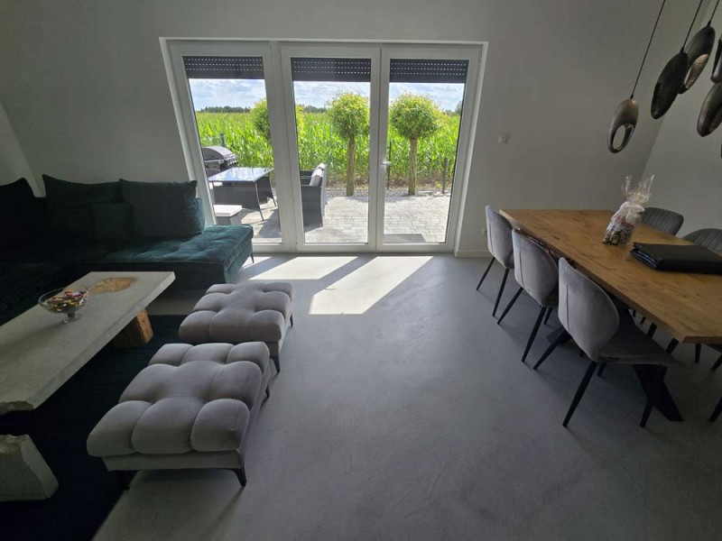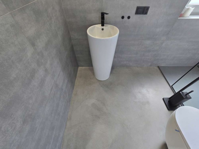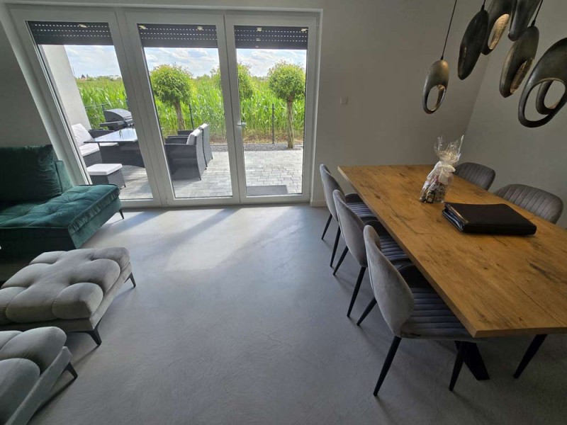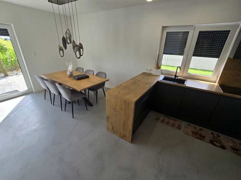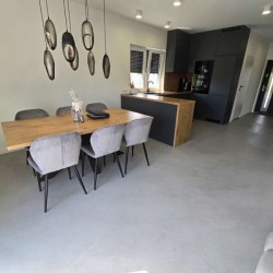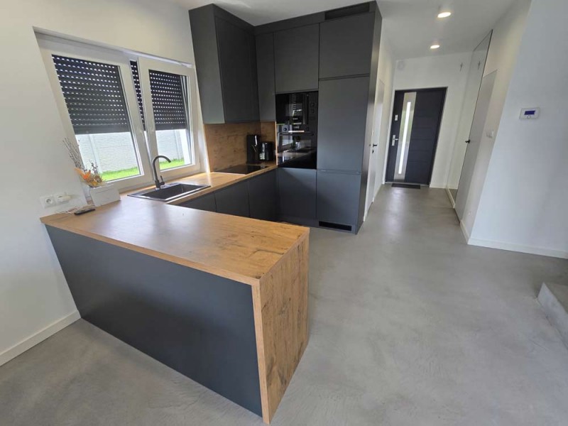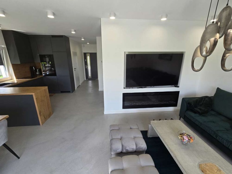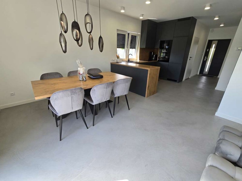 W całym domu zastosowano mikrocementowe podłogi, które nadają wnętrzom nowoczesny, spójny charakter. Garaż, wykończony płytkami, pełni również funkcję pralni – znajduje się tam pralka.