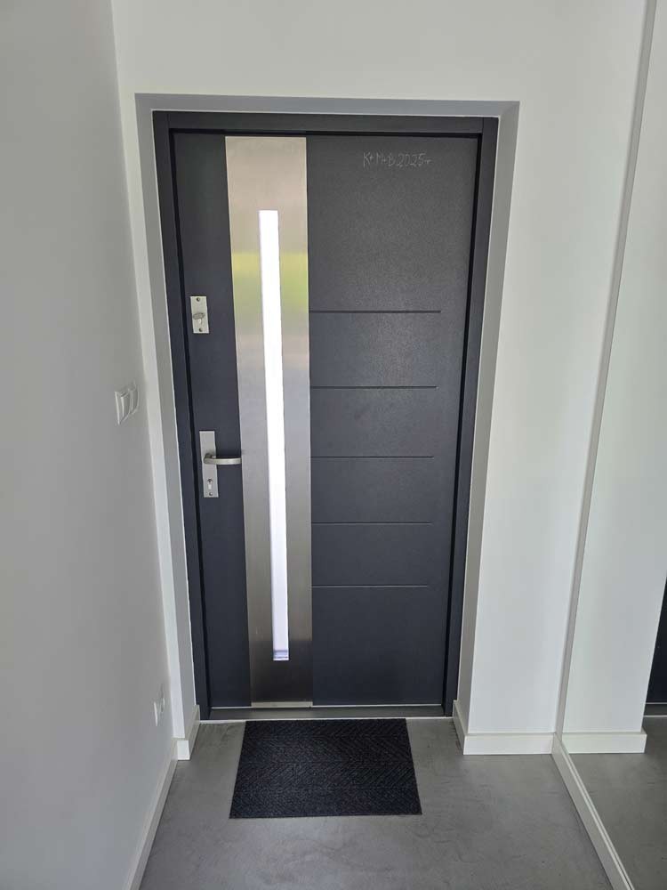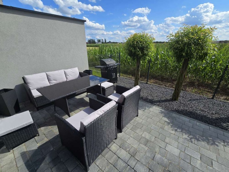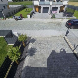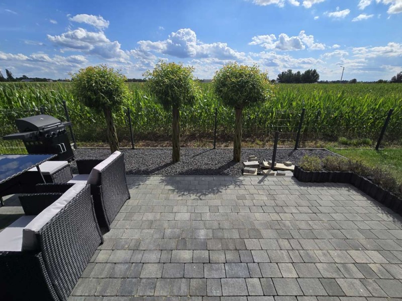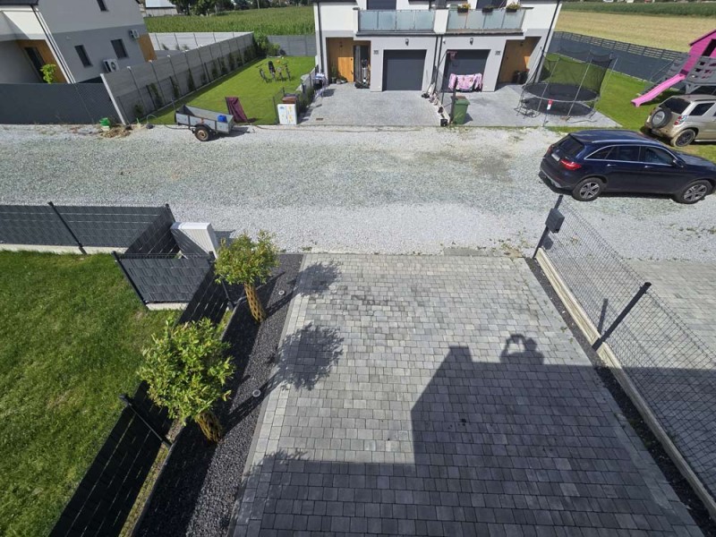 • Kostka brukowa przed wejściem oraz na tarasie – trwałe i estetyczne wykończenie nawierzchni.