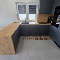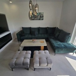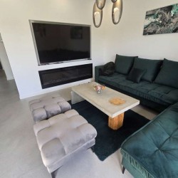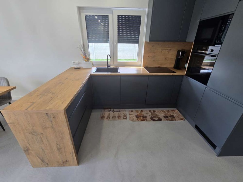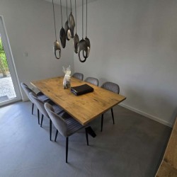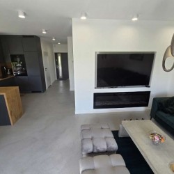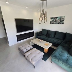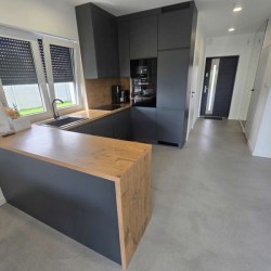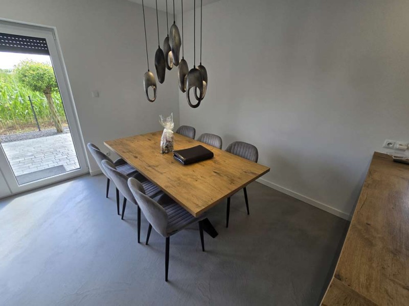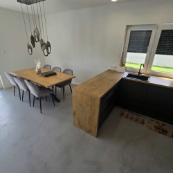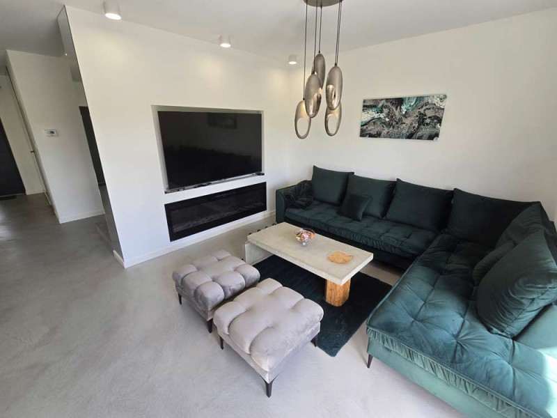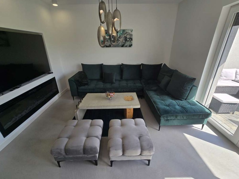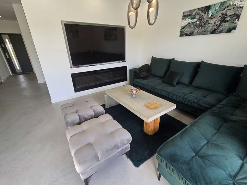 • Salonu z aneksem kuchennym – otwarta przestrzeń dzienna z dużym stołem jadalnianym, elektrycznym kominkiem, dużym telewizorem oraz charakterystycznym stolikiem kawowym z betonu i drewna. Kuchnia wykonana na wymiar, nowoczesna i funkcjonalna, wyposażona w sprzęt gospodarstwa domowego.