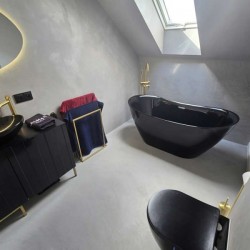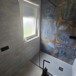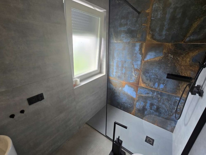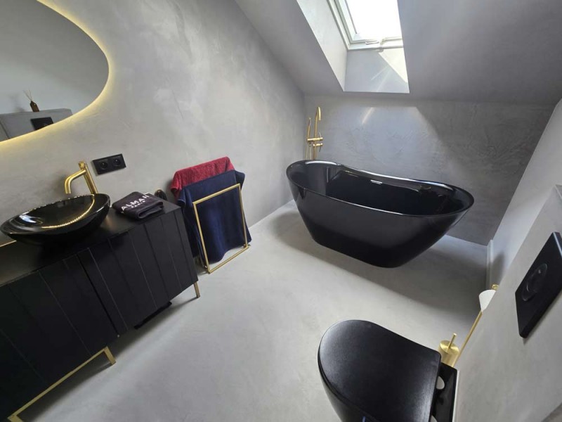 • Górna łazienka (przy sypialni głównej) – luksusowo wykończona, z dwiema umywalkami, wanną oraz oknem dachowym nad wanną, które doświetla przestrzeń naturalnym światłem. Dominują tu czarna armatura i złote dodatki, tworząc elegancką, nowoczesną atmosferę.