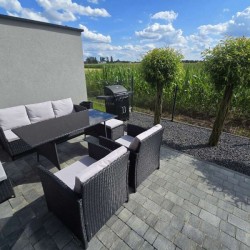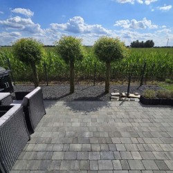 • Taras wykończony naturalnym kamieniem i zakończony trzema efektownymi wierzbami, które zapewniają cień i prywatność.