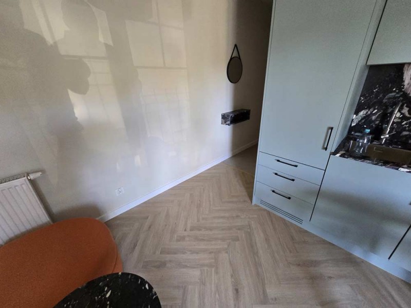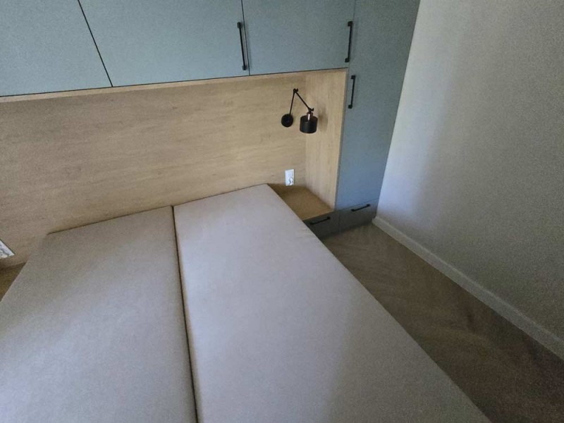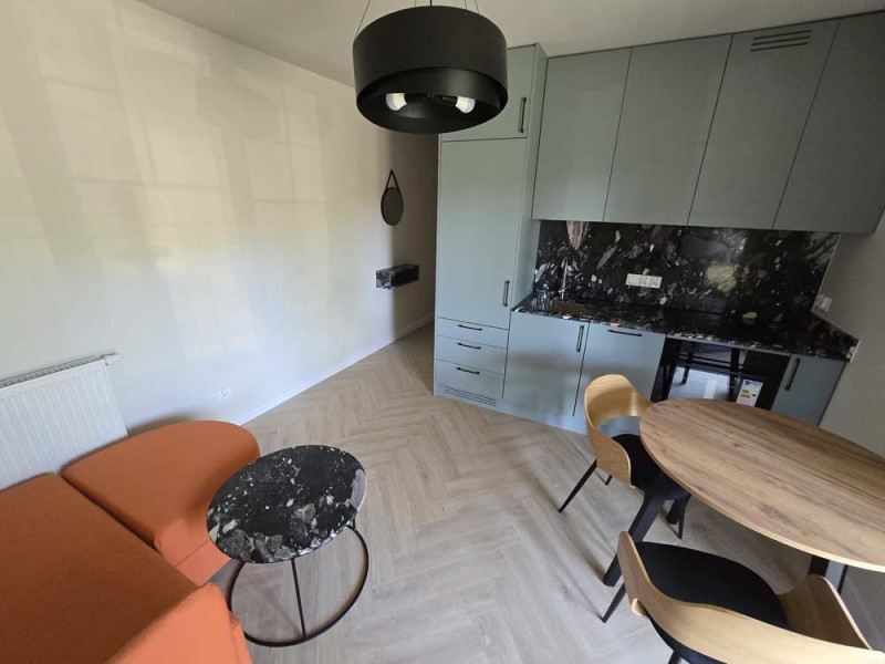 Materiały użyte do wykończenia wnętrza są wysokiej jakości, lokal jest utrzymany w wysokim standardzie. Zamontowane są okna z profili PCV. Ze względów użytkowych i estetycznych podłogi zostały pokryte panelami i wielkoformatowymi kaflami ceramicznymi. Ściany są gipsowane. Kuchnia została umeblowana meblami na wymiar, wyposażono ją w sprzęt gospodarstwa domowego – lodówkę, płytę indukcyjną, piekarnik elektryczny, zmywarkę i pochłaniacz pary. Salon jest klimatyzowany. Łazienka jest wykończona w płytkach ceramicznych, posiada prysznic geberit, umywalkę wraz z szafką oraz pralkę automatyczną. Centralne ogrzewanie i wodę ciepłą kocioł gazowy dwu funkcyjny, grzejniki są stalowe. Cena obejmuje zabudowę trwałą – meble kuchenne wraz ze sprzętem agd oraz pozostałe umeblowanie i wyposażenie.