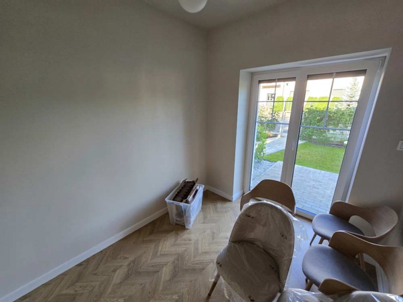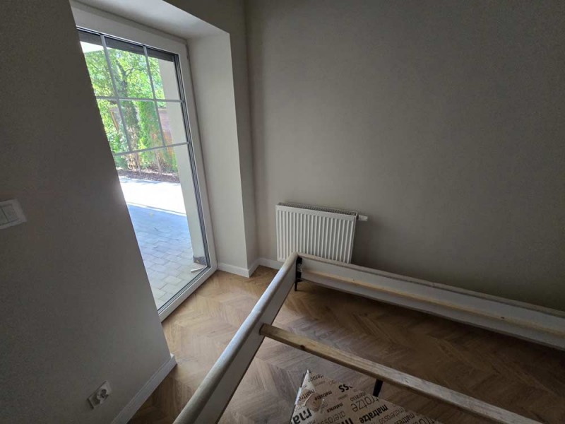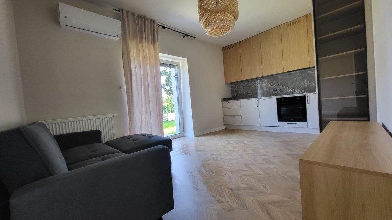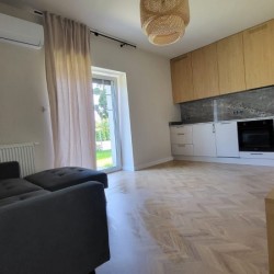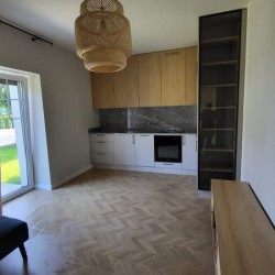 Materiały użyte do wykończenia wnętrza są wysokiej jakości, lokal jest utrzymany w wysokim standardzie. Zamontowane są okna z profili PCV. Ze względów użytkowych i estetycznych podłogi zostały pokryte panelami i wielkoformatowymi kaflami ceramicznymi. Ściany są gipsowane. Kuchnia została umeblowana meblami na wymiar, wyposażono ją w sprzęt gospodarstwa domowego – lodówkę, płytę indukcyjną, piekarnik elektryczny, zmywarkę i pochłaniacz pary. Salon jest klimatyzowany. Łazienka jest wykończona w płytkach ceramicznych, posiada prysznic geberit, umywalkę wraz z szafką oraz pralkę automatyczną. Centralne ogrzewanie i wodę ciepłą kocioł gazowy dwu funkcyjny, grzejniki są stalowe. Cena obejmuje zabudowę trwałą – meble kuchenne wraz ze sprzętem agd oraz pozostałe umeblowanie i wyposażenie.