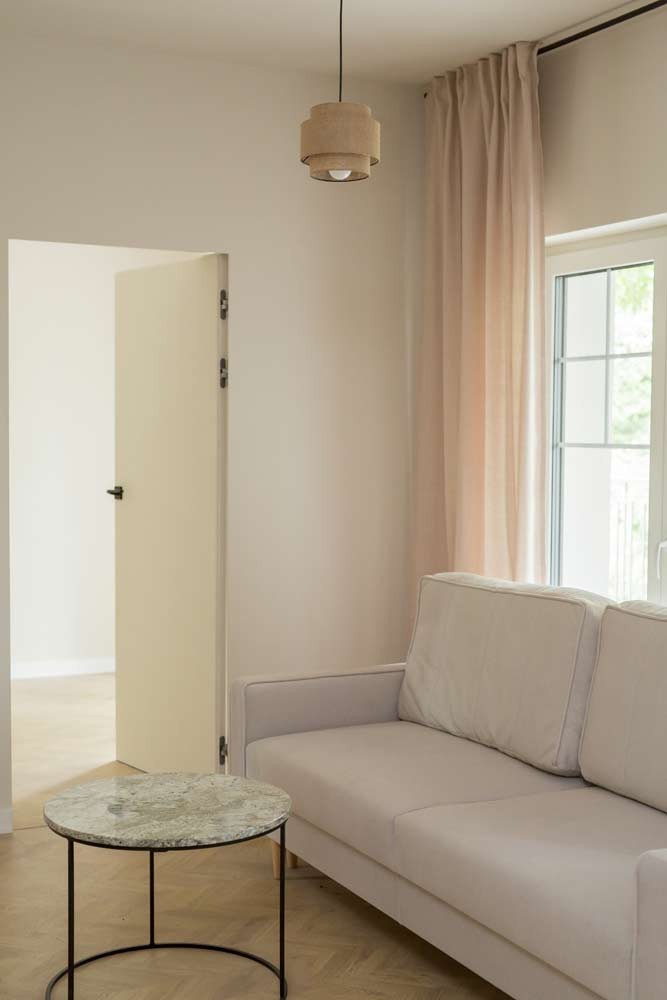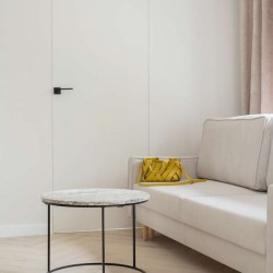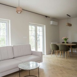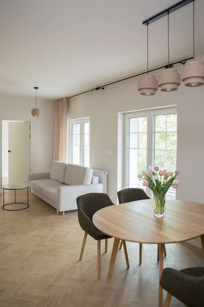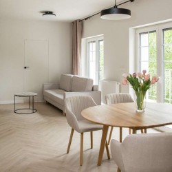 Materiały użyte do wykończenia wnętrza są wysokiej jakości, lokal jest utrzymany w wysokim standardzie. Zamontowane są okna z profili PCV. Ze względów użytkowych i estetycznych podłogi zostały pokryte panelami i wielkoformatowymi kaflami ceramicznymi. Ściany są gipsowane. Kuchnia została umeblowana meblami na wymiar, wyposażono ją w sprzęt gospodarstwa domowego – lodówkę, płytę indukcyjną, piekarnik elektryczny, zmywarkę i pochłaniacz pary. Salon jest klimatyzowany. Łazienka jest wykończona w płytkach ceramicznych, posiada prysznic geberit, umywalkę wraz z szafką oraz pralkę automatyczną. Centralne ogrzewanie i wodę ciepłą kocioł gazowy dwu funkcyjny, grzejniki są stalowe. Cena obejmuje zabudowę trwałą – meble kuchenne wraz ze sprzętem agd oraz pozostałe umeblowanie i wyposażenie.