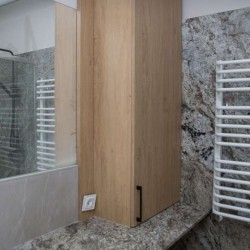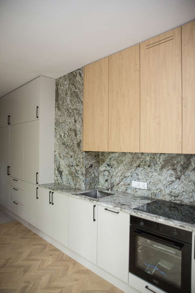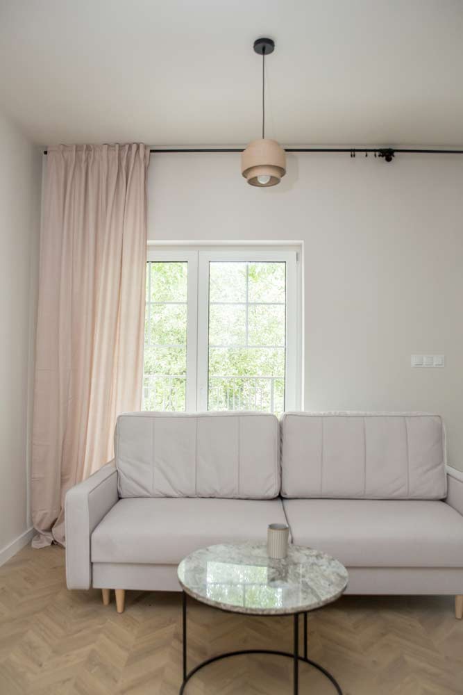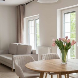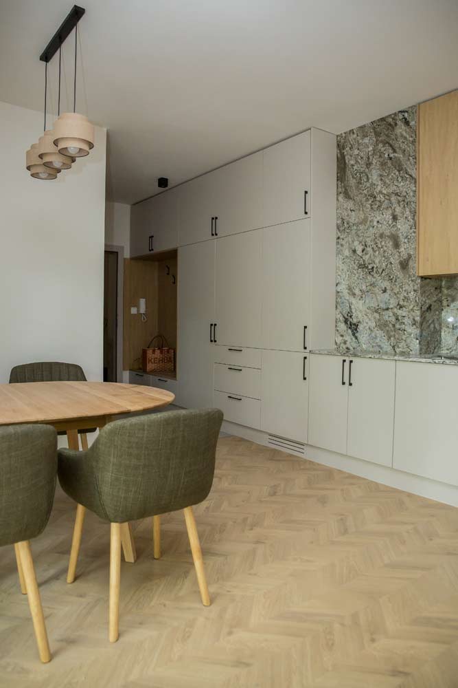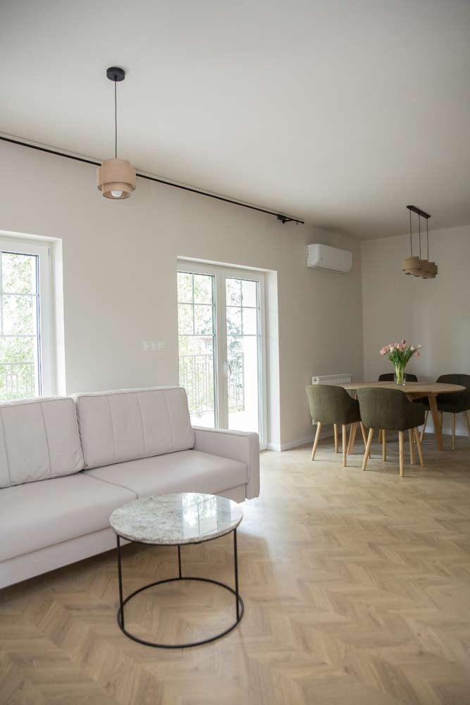 Materiały użyte do wykończenia wnętrza są wysokiej jakości, lokal jest utrzymany w wysokim standardzie. Zamontowane są okna z profili PCV. Ze względów użytkowych i estetycznych podłogi zostały pokryte panelami i wielkoformatowymi kaflami ceramicznymi. Ściany są gipsowane. Kuchnia została umeblowana meblami na wymiar, wyposażono ją w sprzęt gospodarstwa domowego – lodówkę, płytę indukcyjną, piekarnik elektryczny, zmywarkę i pochłaniacz pary. Salon jest klimatyzowany. Łazienka jest wykończona w płytkach ceramicznych, posiada prysznic geberit, umywalkę wraz z szafką oraz pralkę automatyczną. Centralne ogrzewanie i wodę ciepłą kocioł gazowy dwu funkcyjny, grzejniki są stalowe. Cena obejmuje zabudowę trwałą – meble kuchenne wraz ze sprzętem agd oraz pozostałe umeblowanie i wyposażenie.