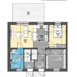 Powierzchnia lokalu wynosi 56,46 m2. Lokal zostanie wykończony tynkami gipsowymi i wyposażony w podłogowe ogrzewanie gazowe. Wewnątrz mamy do dyspozycji usytuowany od strony zachodniej pokój dzienny z aneksem kuchennym i wyjściem do ogrodu z tarasem, dwie sypialnie, łazienkę, schowek i wiatrołap.