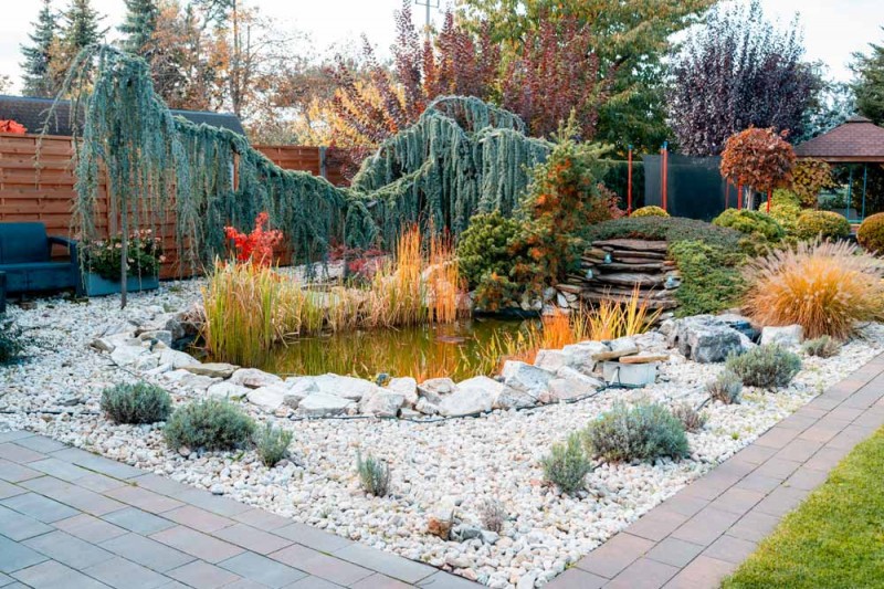 Teren posesji jest ogrodzony i bezpieczny, front działki został ogrodzony płotem metalowym na podmurówce. Brama wjazdowa jest sterowana zdalnie. Wjazd i chodnik utwardzono betonową kostką. Urządzony jest ogród z licznymi nasadzeniami drzew, bylin i krzewów ozdobnych. W tylnej części działki urządzono miejsce służące do wypoczynku i rekreacji, tutaj mamy do dyspozycji zadaszoną altankę grillową, skalniak i oczko wodne. Ogród posiada system automatycznego nawadniania.