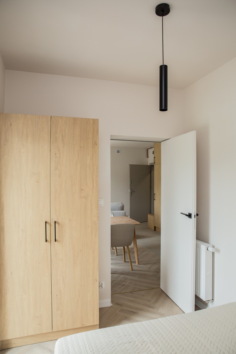Lokal ten stanowi odrębną własność z udziałem w gruncie i księgą wieczystą a jego powierzchnia użytkowa wynosi 34,56 m2. Mieszkanie jest położone na drugim piętrze. Układ pomieszczeń został zaprojektowany w sposób nowoczesny i przestrzenny. Wewnątrz mamy do dyspozycji pokój dzienny z aneksem kuchennym, jedną sypialnię, łazienkę, przedpokój oraz balkon o pow. 8,40 m2.