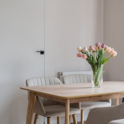 Materiały użyte do wykończenia wnętrza są wysokiej jakości, lokal jest utrzymany w wysokim standardzie. Zamontowane są okna z profili PCV. Ze względów użytkowych i estetycznych podłogi zostały pokryte panelami i wielkoformatowymi kaflami ceramicznymi. Ściany są gipsowane. Kuchnia została umeblowana meblami na wymiar, wyposażono ją w sprzęt gospodarstwa domowego – lodówkę, płytę indukcyjną, piekarnik elektryczny, zmywarkę i pochłaniacz pary. Salon jest klimatyzowany. Łazienka jest wykończona w płytkach ceramicznych, posiada prysznic geberit, umywalkę wraz z szafką oraz pralkę automatyczną. Centralne ogrzewanie i wodę ciepłą kocioł gazowy dwu funkcyjny, grzejniki są stalowe. Cena obejmuje zabudowę trwałą – meble kuchenne wraz ze sprzętem agd oraz pozostałe umeblowanie i wyposażenie.
