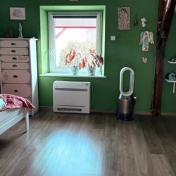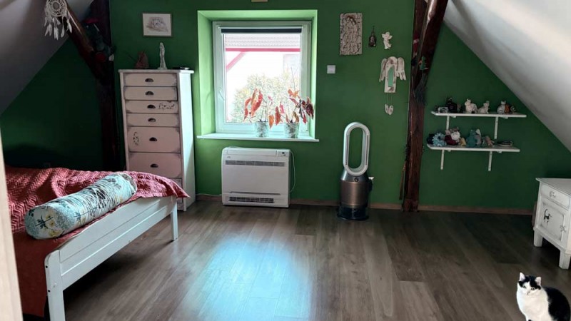 Większość parteru ogrzewana jest podłogowo, dzięki czemu w domu panuje przyjemne, równomierne ciepło, możesz chodzić boso nawet zimą, a wnętrza są bardziej przestronne i przytulne – bez kaloryferów zajmujących miejsce. Dodatkowo w domu znajdują się dwa klimatyzatory, które zapewniają komfortową temperaturę latem i szybkie dogrzanie pomieszczeń zimą, niezależnie od warunków na zewnątrz.