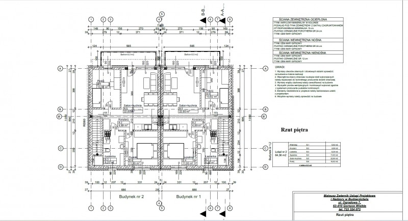 Każdy segment składa się z dwóch lokali mieszkalnych (jednego na parterze i jednego na piętrze). Są one usytuowane od strony północnej i południowej. Niezależne wejścia do lokali zaprojektowano w elewacji frontowej każdego z segmentów. Do lokalu na piętrze prowadzi wydzielona klatka schodowa dostępna bezpośrednio z zewnątrz budynku, w celu zapewnienia Państwu prywatności. Budynek jest budynkiem piętrowym, niepodpiwniczonym, przykrytym dachem płaskim. Materiałem budowy jest pustak ceramiczny, który zostanie docieplony zewnętrznie styropianem i pokryty tynkiem. Ściany wewnętrzne będą wykończone tynkiem maszynowym. Mieszkania wyposażone zostaną w rolety zewnętrzne aluminiowe i drzwi antywłamaniowe, w celu zwiększenia Państwa komfortu i bezpieczeństwa oraz okna z profili PCV - 3 szybowe. Do każdego lokalu mieszkalnego przynależy jedno miejsce parkingowe przed wejściem do budynku.